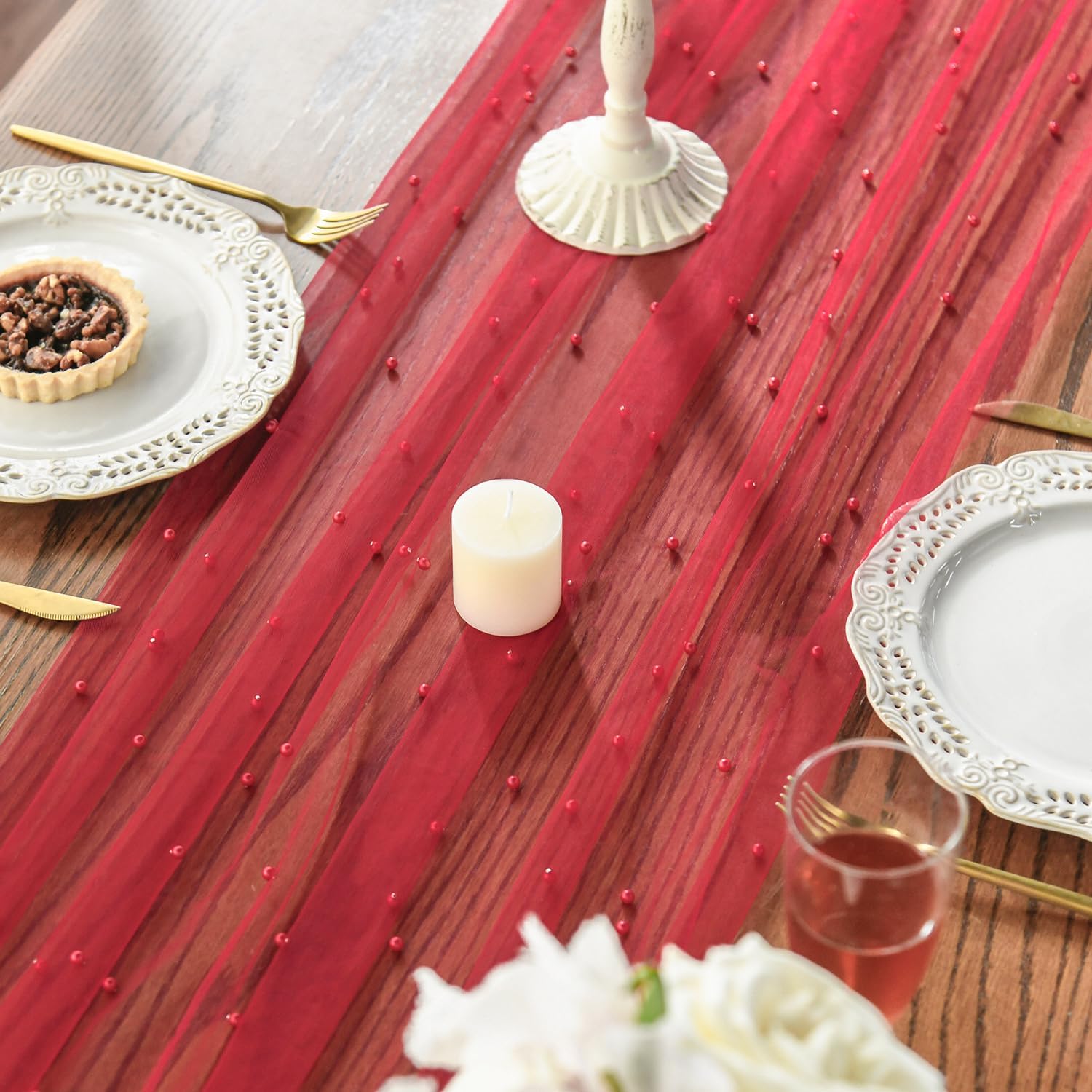 Artoid Mode Pearl Red Gauze Table Runner 120 Inch 10FT, Seasonal Sheer Dining Holiday Wedding Birthday Baby Shower Table Decor for Home Party