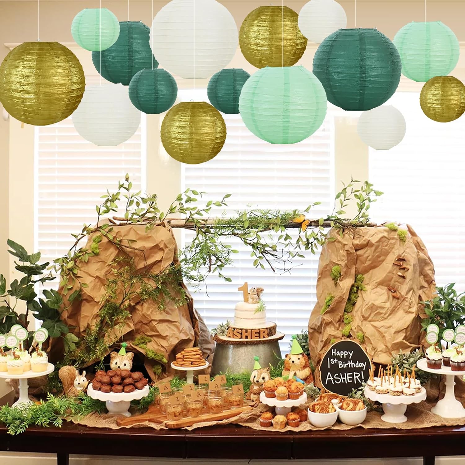 - Included Components : Paper lanterns (6 inch, 8 inch, 10 inch), sage green, forest green, gold, white (10 pieces)