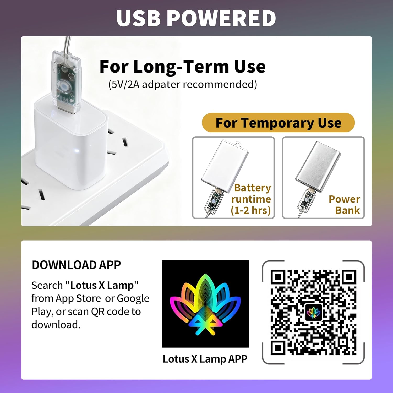 - USB Powered: Use a UL certified 5V, ≥2A USB adapter for stable operation and vivid color-changing effects. (Insufficient power may cause unresponsive controls or failure to illuminate.) The AA battery pack is intended for temporary setup only. Approx. runtime: 1-2 hours with 3 AA batteries (varies by battery type and quality).