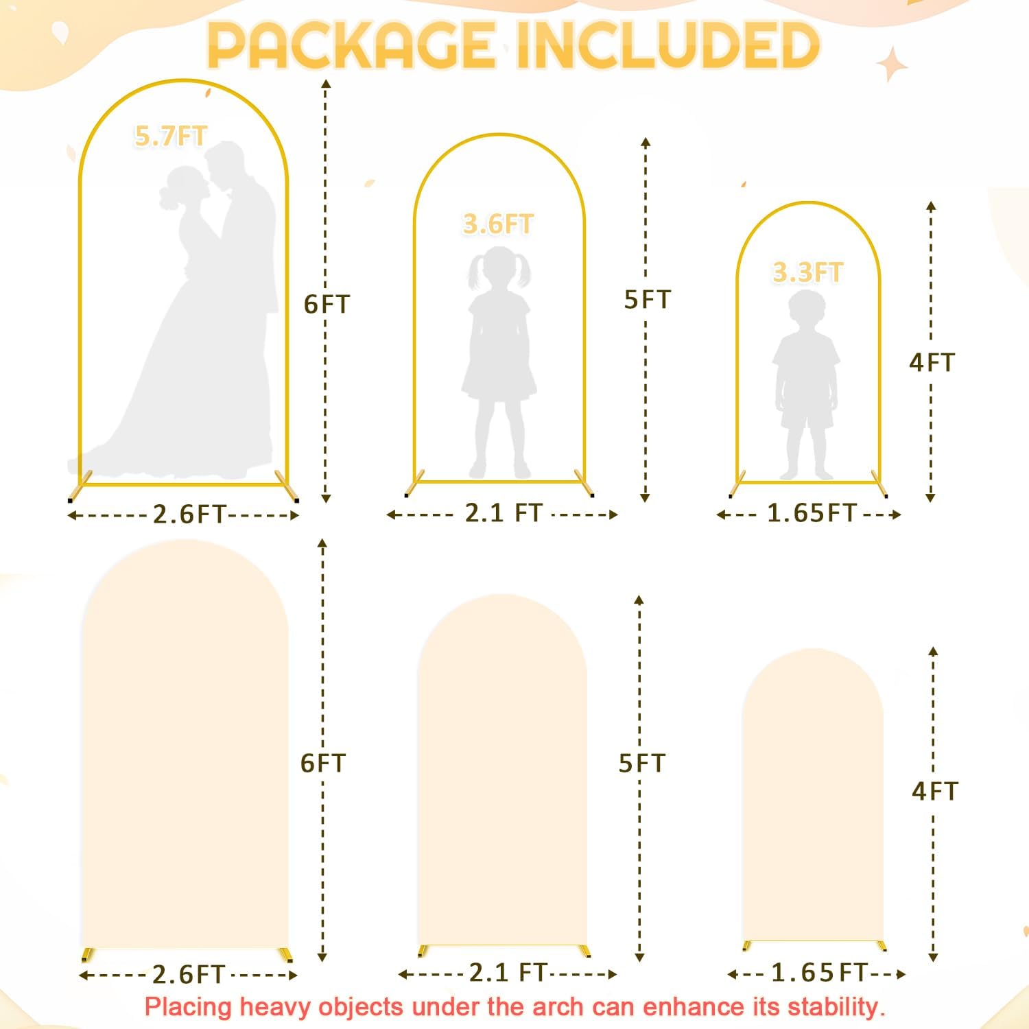 - đ„ăPackage Included - Metal Arch Backdrop Stand and Cover SetăYou will receive 3 gold metal arch backdrop stand and 3 beige arch cover. Size: Size: 6ft H x 2.6ft W, 5ft H x 2.1ft W, 4ft H x 1.65ft W. Let's create unforgettable moments with our arch backdrop stand cover!
