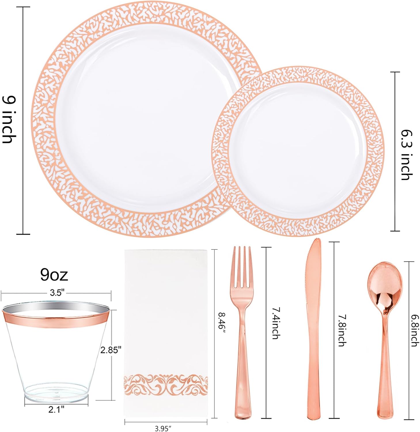 - SERVE FOR 50 GUESTS: Our plastic rose gold plates set for you to prepare 10.25 β&7.5β plates,and rose gold silverware ,In addition, a 9oz cup and lace printed tissues are also prepared for you, and this rose gold plates and napkins party supplies can fully meet the needs of your large party of 50 guests,