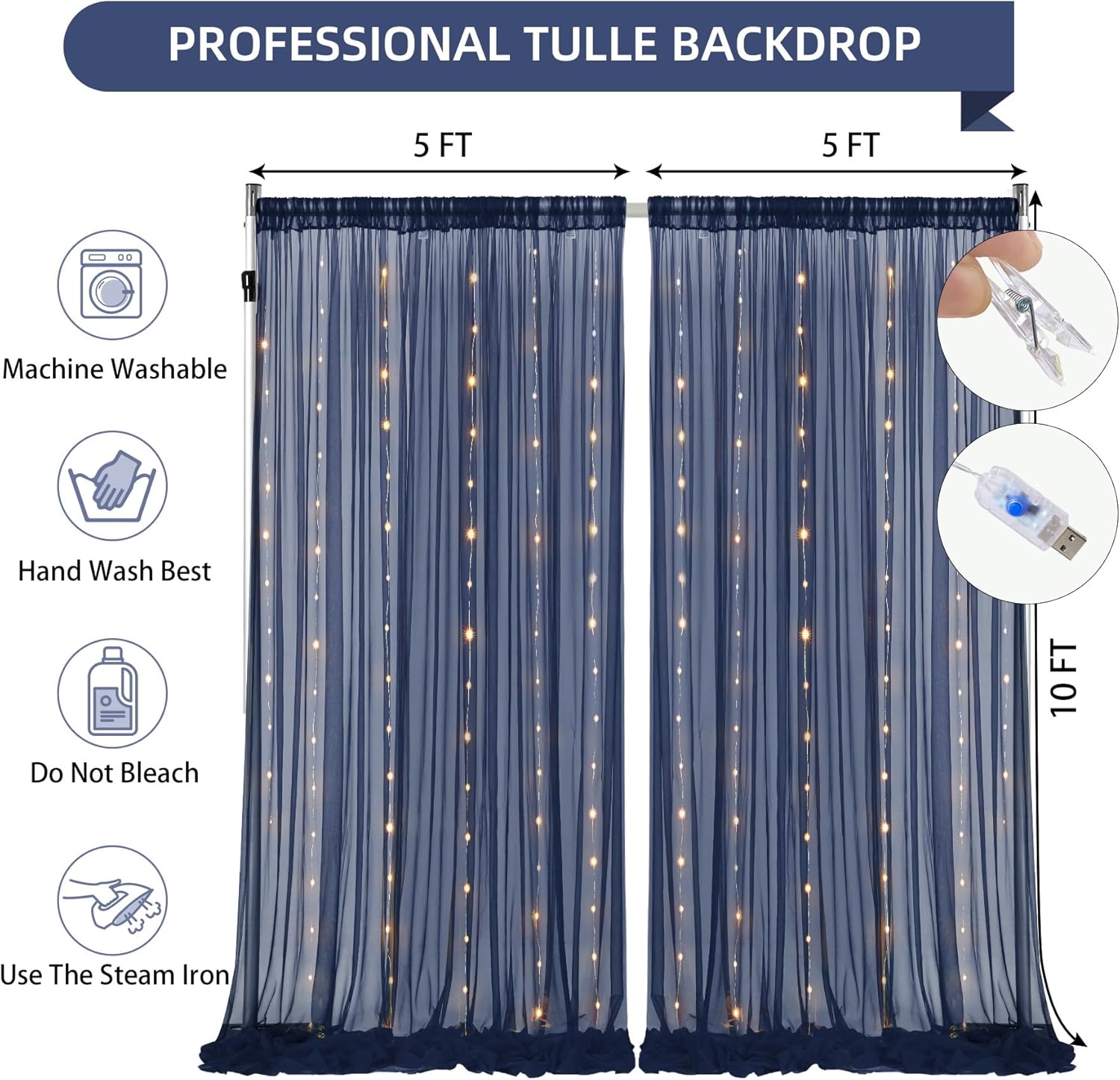 - Size: Package including 2 panels 5ft width by 10ft height navy blue backdrop curtains with lights, a set of 9.8ft warm white lights and 12pcs Transparent clips. High quality navy blue tulle fabric, collapsible without creases, Beautiful Sheer Drapes! Can be reused. If you want a thicker/fuller look, you would need more