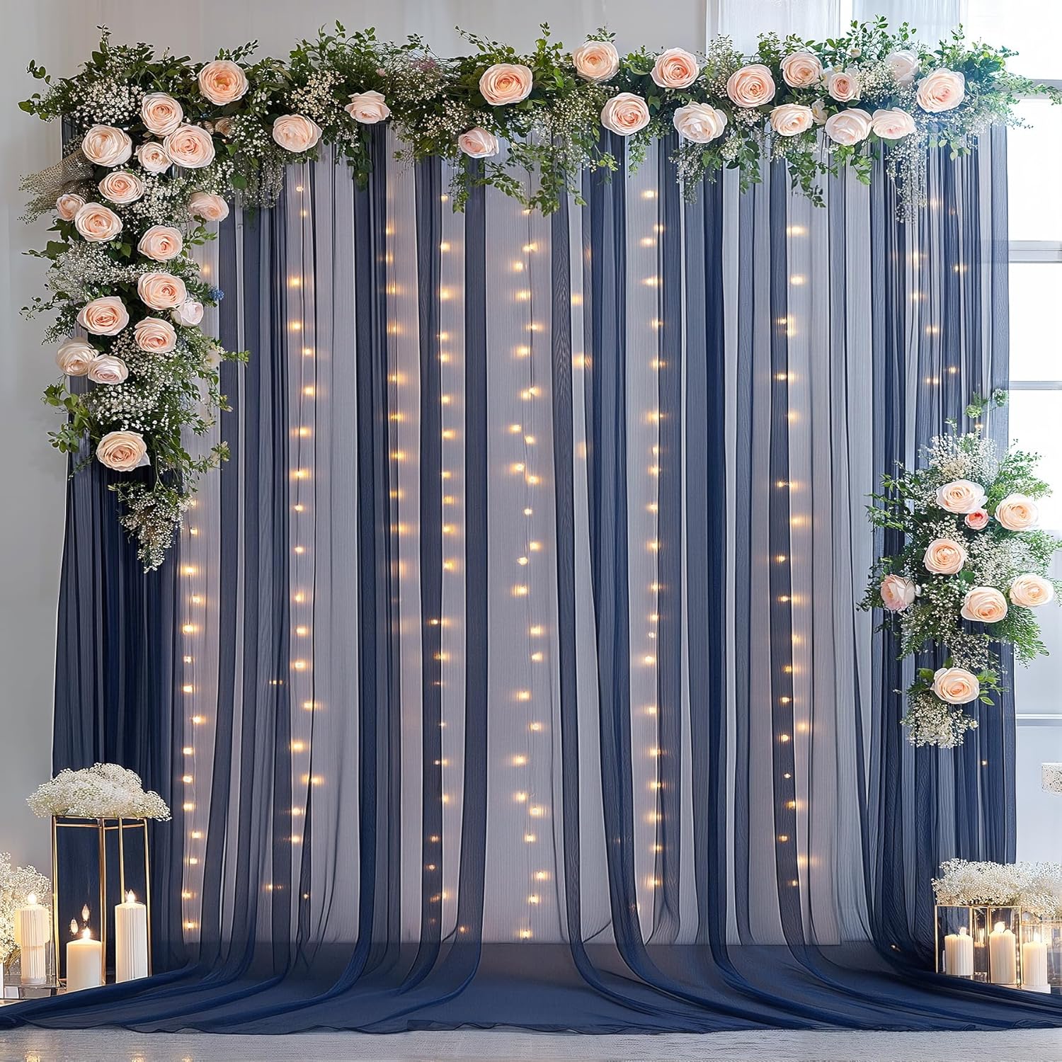 - Size: Package including 4 panels 5ft width by 10ft height navy blue backdrop curtains with lights, a set of 9.8ft warm white lights and 12pcs Transparent clips. High quality navy blue tulle fabric, collapsible without creases, Beautiful Sheer Drapes! Can be reused. If you want a thicker/fuller look, you would need more