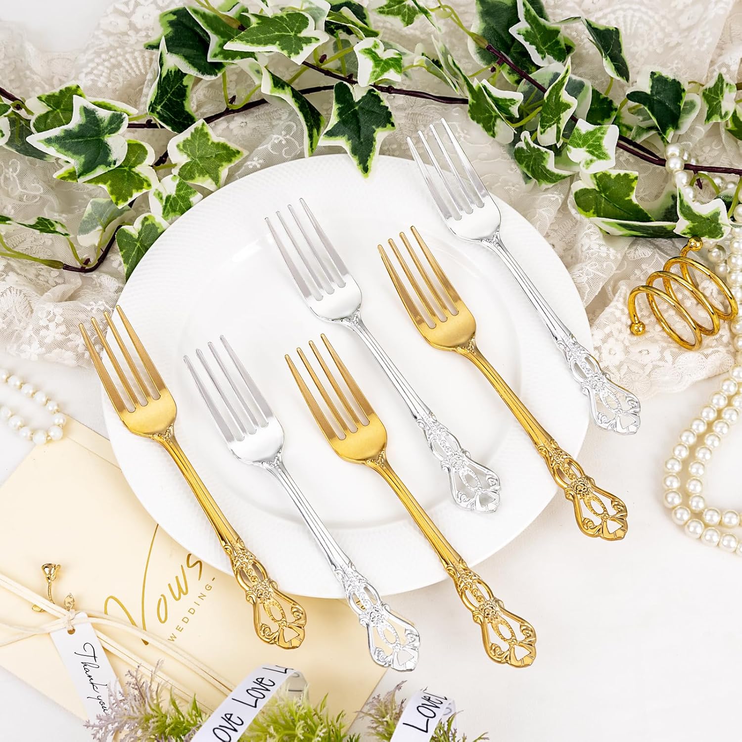 - Unique Ornate Handle Design: Features intricate Vintage lace-cut handles for unparalleled elegance. This fancy silver forks disposable for wedding adds Elegant sophistication to every table setting