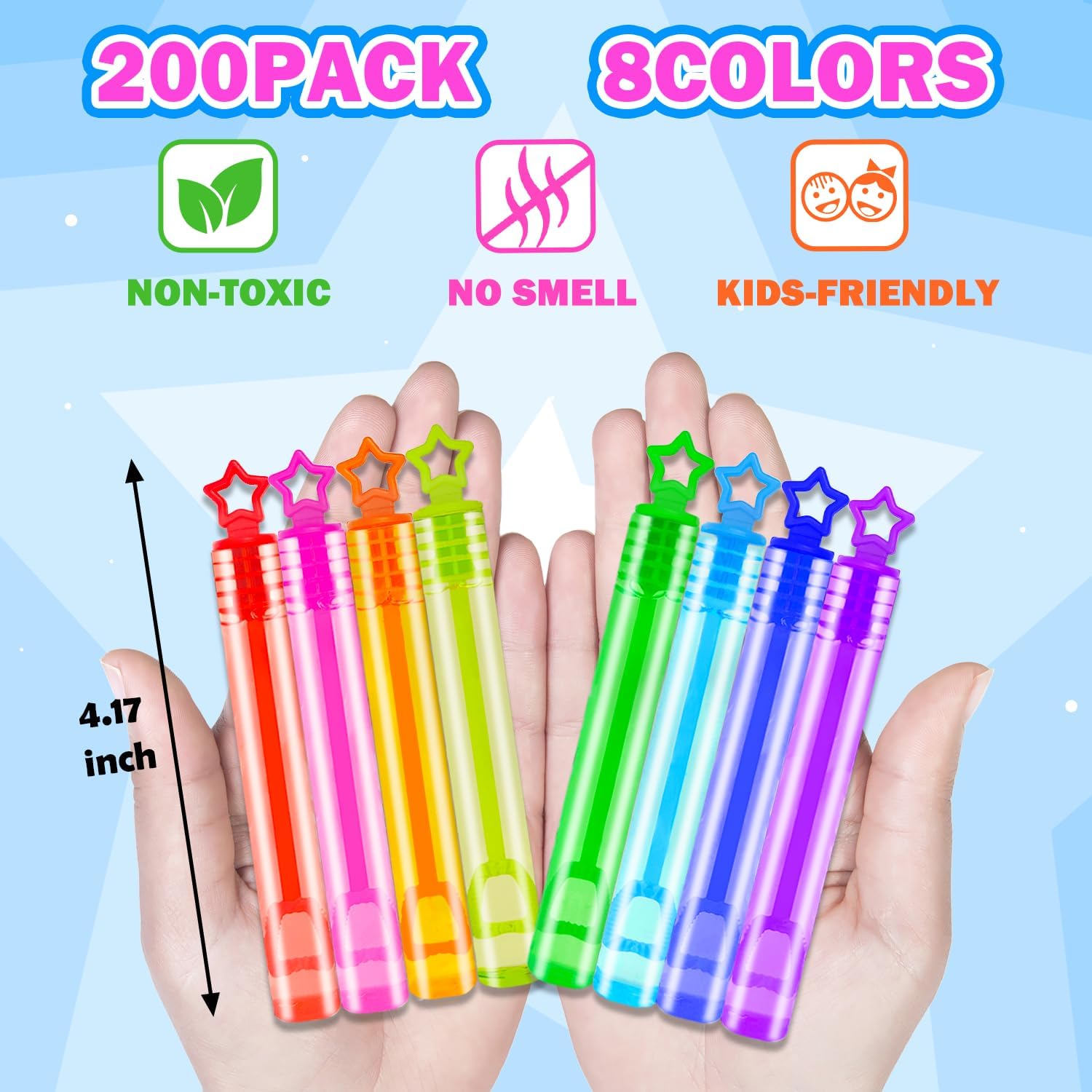 - 200 - Pack Mini Bubble Wands β Features eye-catching star-shaped handles in 8 vibrant neon rainbow colors, adding a playful sparkle to every bubble blast.