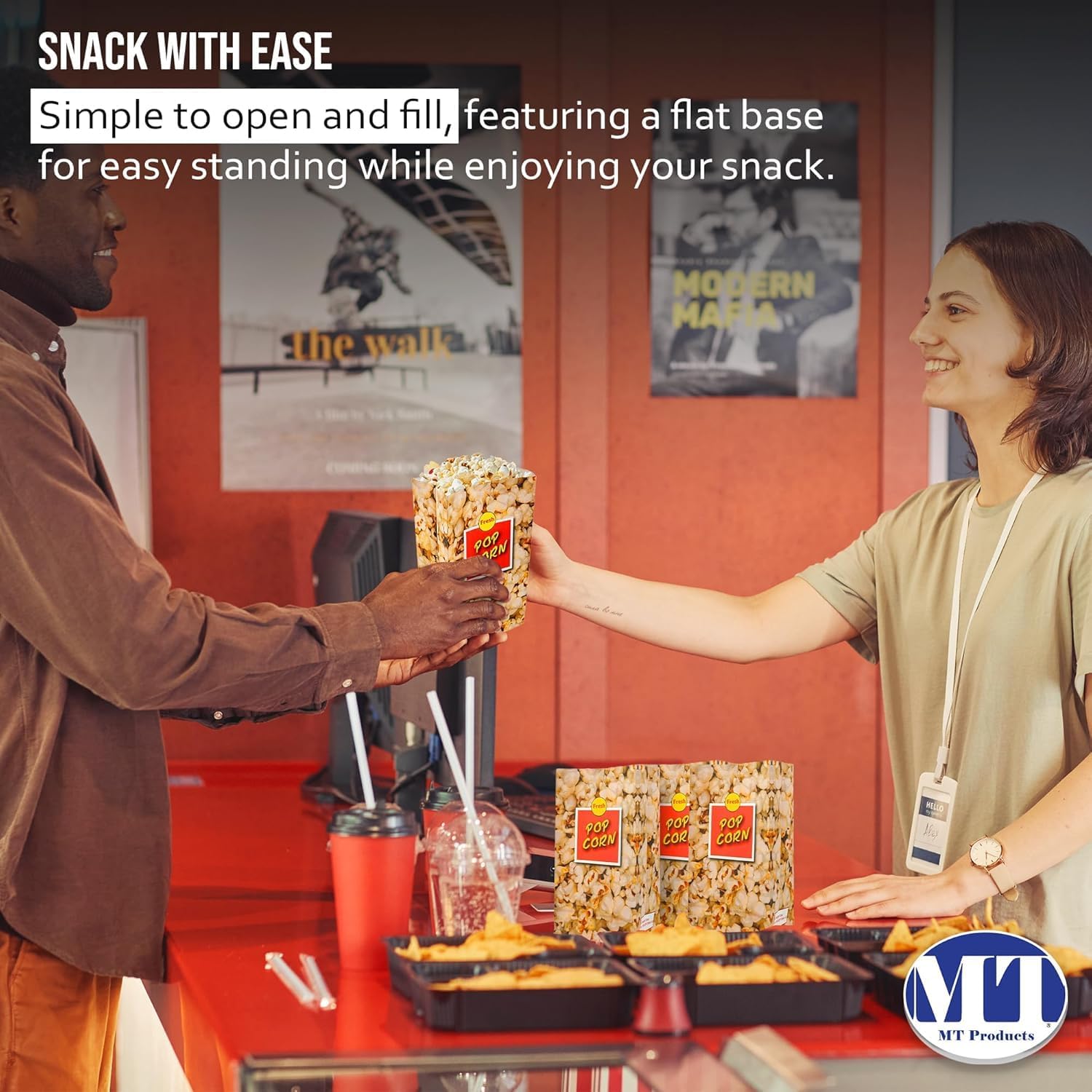- The stand-up feature of these popcorn bags for popcorn machine allows for easy filling, serving, and display, enhancing convenience and presentation at gatherings.