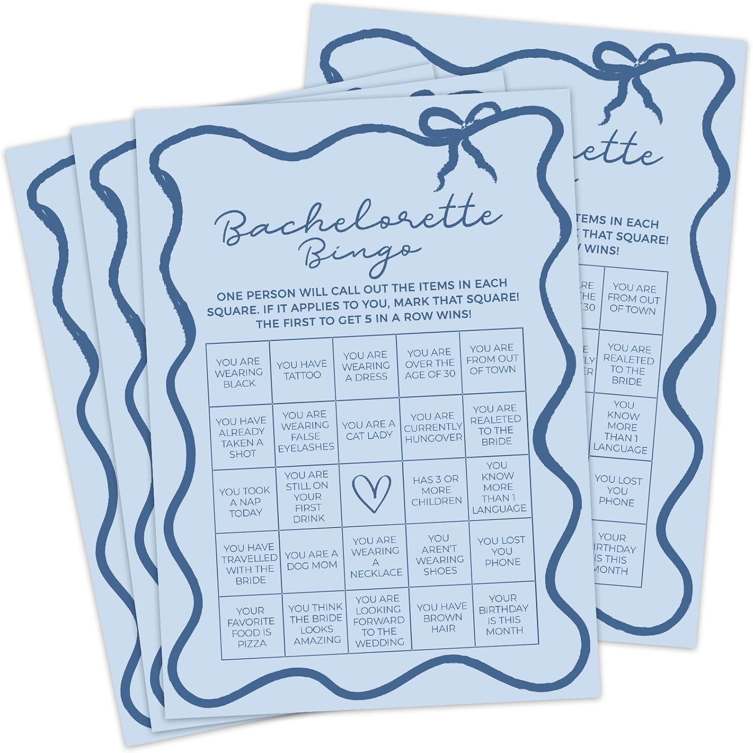 DEEKA 30 PCS Bridal Shower Games Card for 30 Guests Blue Wavy Border Ribbon Bow Funny Wedding Bachelorette Party Games for Reception (Bachelorette Bingo)