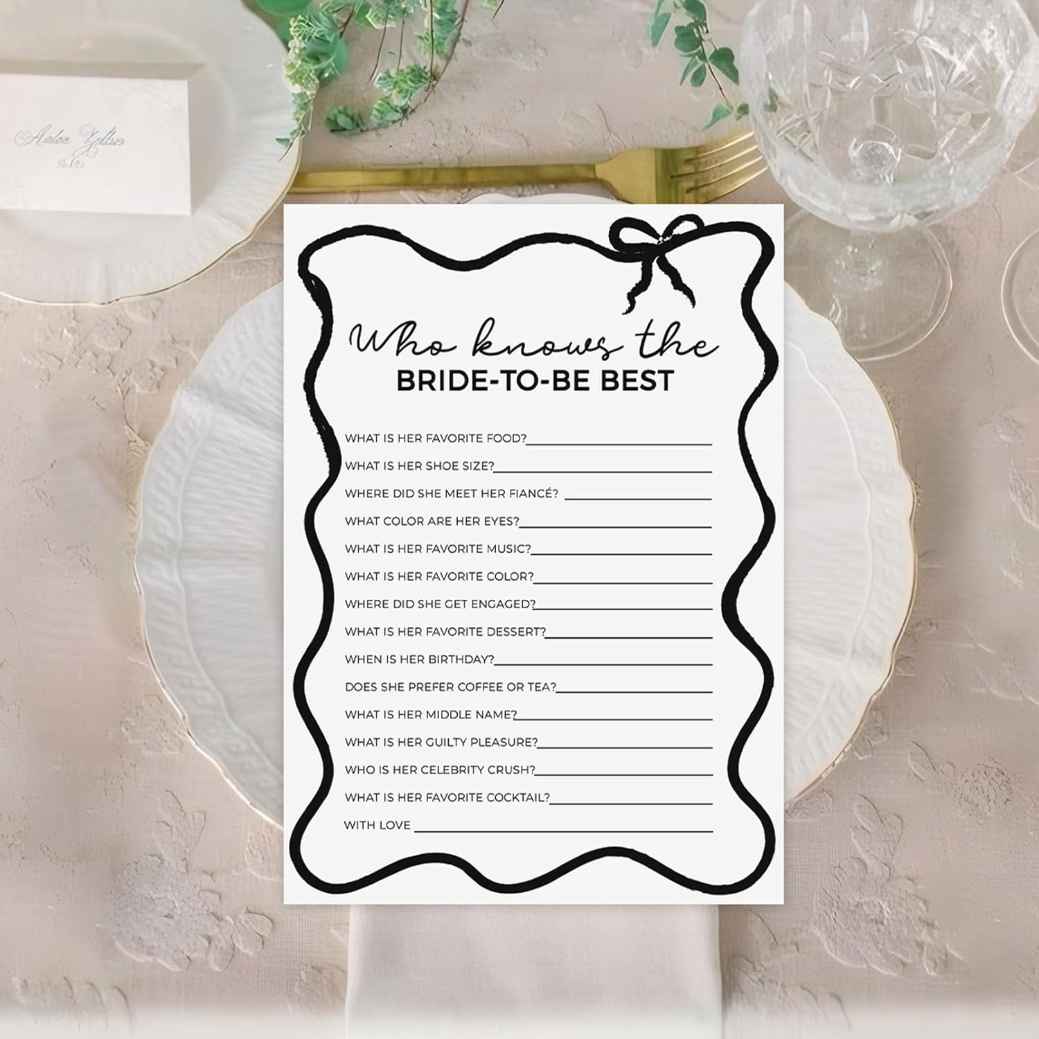 DEEKA 30 PCS Bridal Shower Games Card for 30 Guests Black Wavy Border Ribbon Bow Funny Wedding Bachelorette Party Games for Reception (Who Knows The Bride-to-be Best)