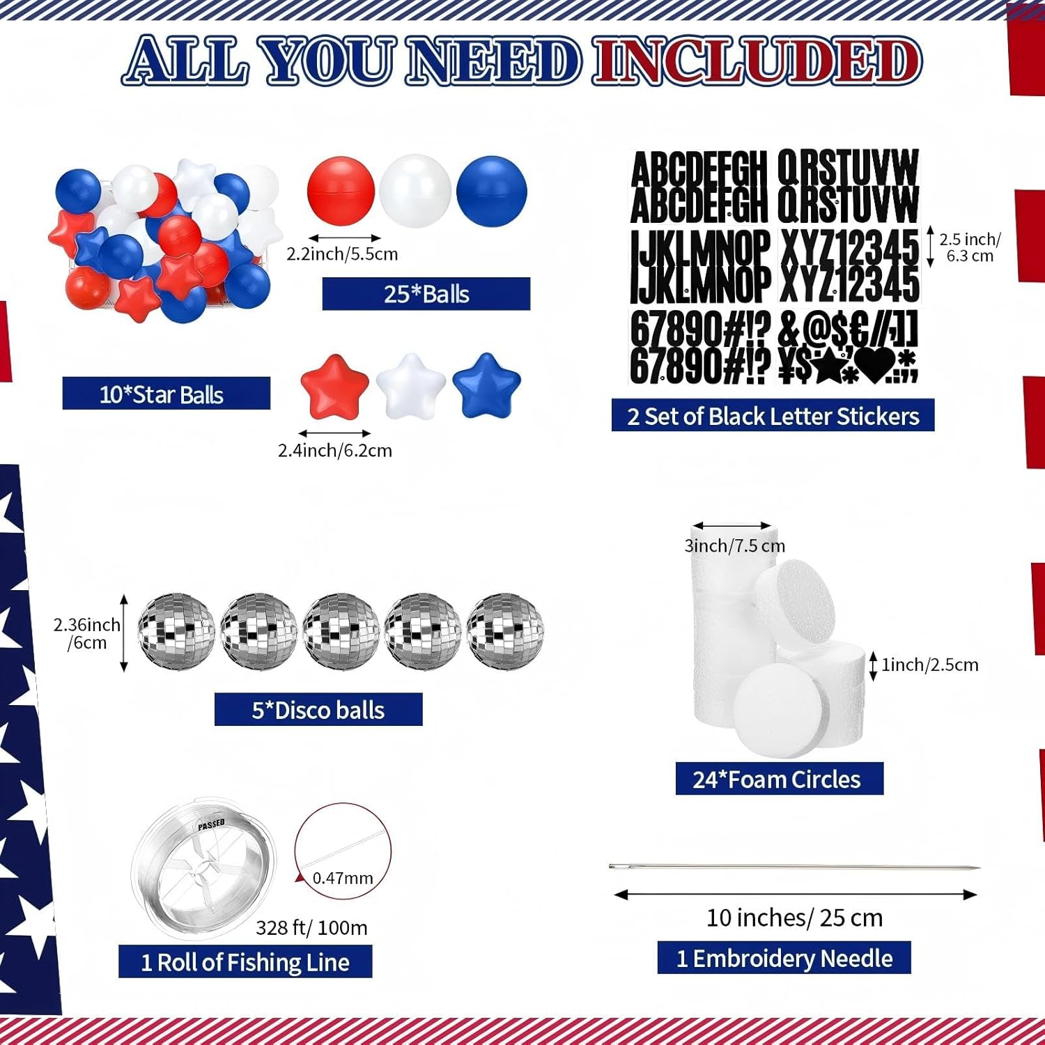 - 4th of July Party Decorations: you can expect to get 25 balls, 10 star shaped balls, 5 disco balls, 24 foam circles, an embroidery needle, 2 sets of letter stickers, and a roll of fishing line; This is a complete DIY package for you