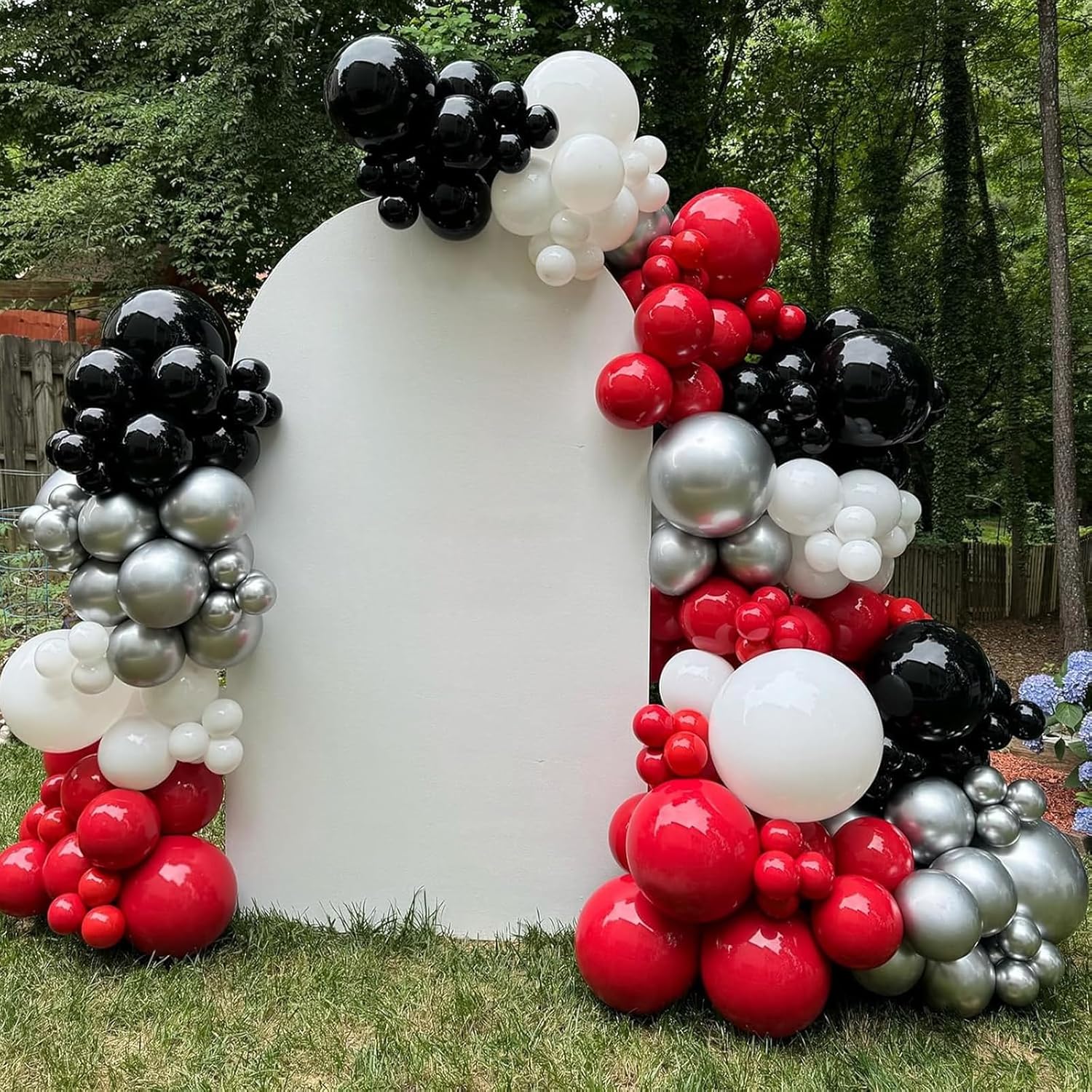 - Double Stuffed Red and Black White Balloons Set: This Dark Red Chrome Sliver Balloons kit includes 60 high-quality 12-inch balloons in four colors: 15pcs double stuffed red latex balloons, 15pcs matte black latex balloons, 15pcs matte white latex balloons and 15pcs silver latex balloons, plus a black ribbon. It’s perfect for decorating racing car party, bachelorette party, valentines, and graduation prom parties, adding a vibrant touch to any celebration