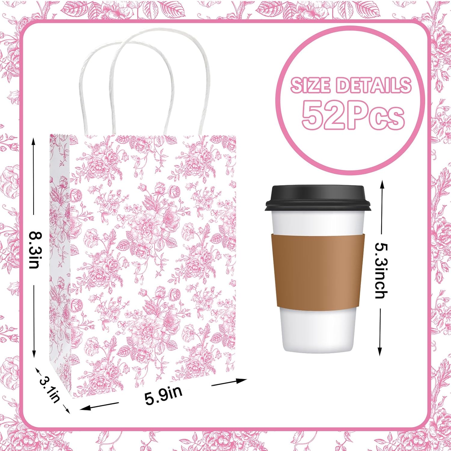 JarThenaAMCS 52Pcs Pink Floral Paper Gift Bag Vintage Wildflower Treat Bags with Handles Chinoiserie Candy Goodie Bags for Spring Summer Birthday Wedding Bridal Shower Party Favors Supplies