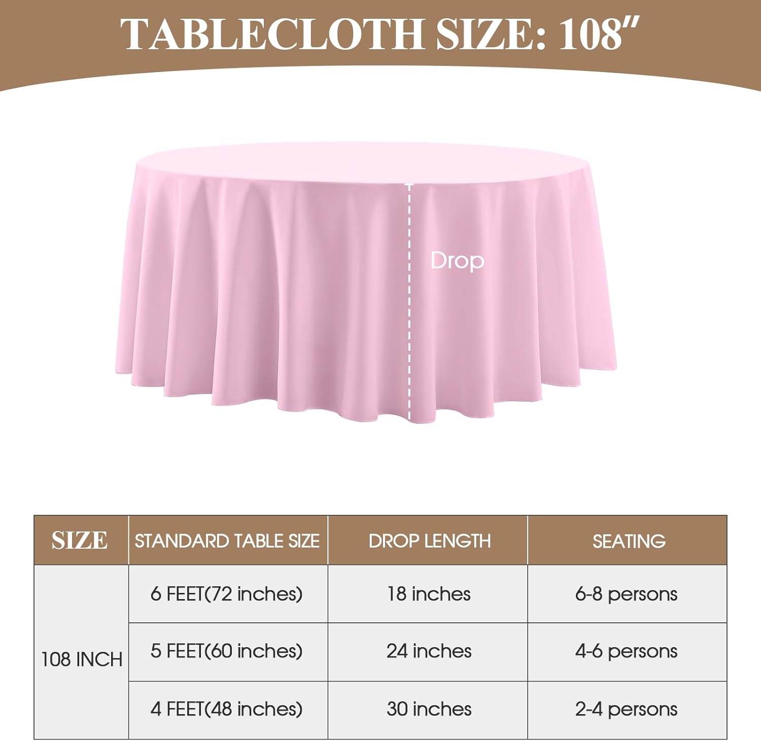 - Suitable Size: This polyester round tablecloth has multiple sizes to choose from, 90, 108, 120, 108 inches, which can meet the needs of tables of different sizes. In order to buy a tablecloth that is more suitable for your table, please measure the actual size of your table before purchasing and refer to our size chart