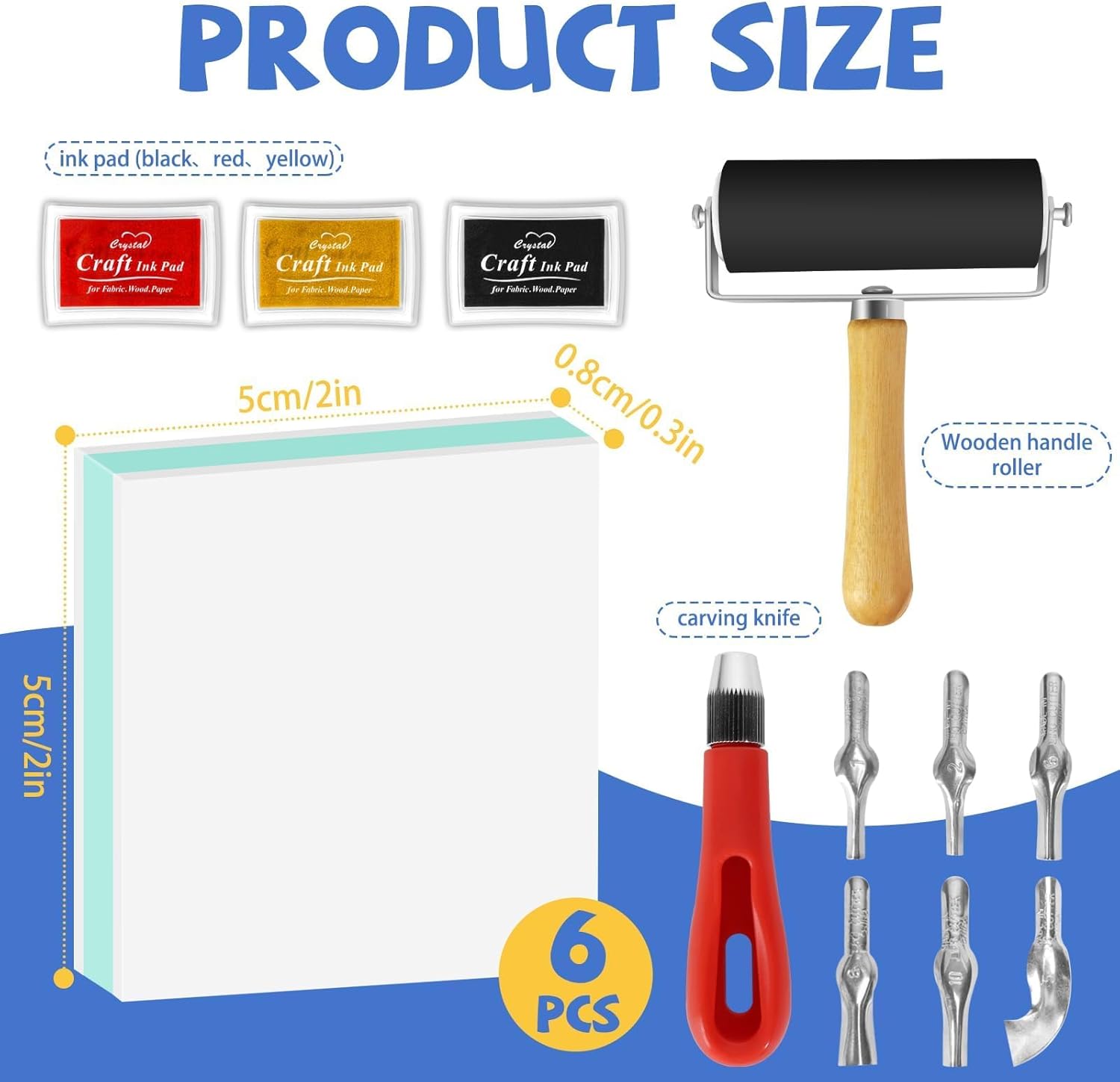 - Combination: 6 white and green rubber bricks, three-color ink pads (red, black, and yellow), a carving knife, and a wooden-handled roller. This is a set suitable for beginners.