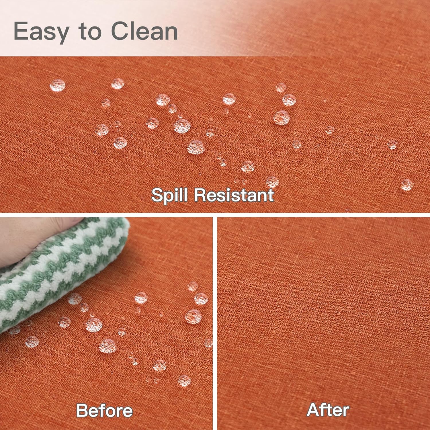 - **Easy to Care: **These tablecloths are spill-proof, water resistant. All liquids bead up for easy cleaning. Machine wash in cold water and tumble dry. Little or no ironing required. DO NOT BLEACH.