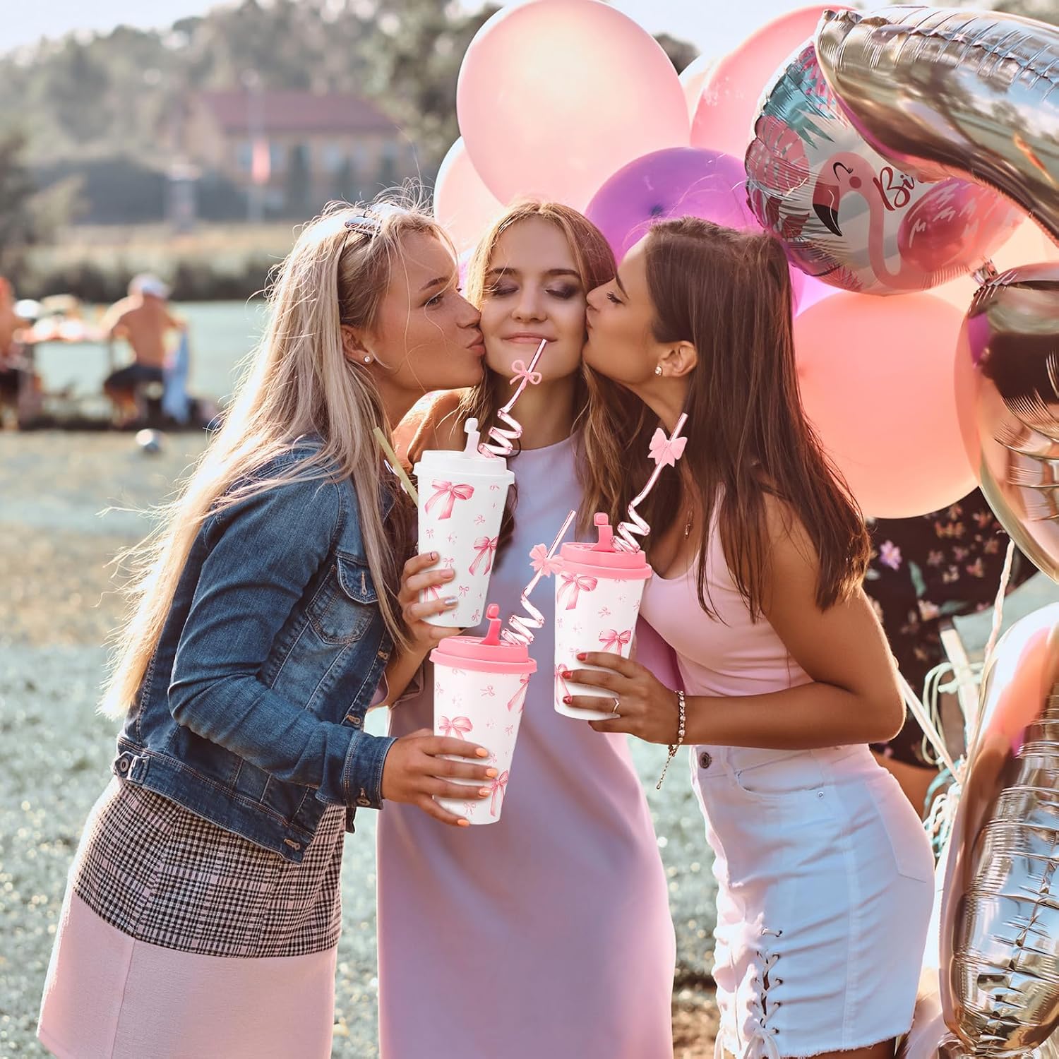- Abundant Pink Bow Party Favors: revel in the charm of our Pink Bow birthday party supplies; Each package includes an ample amount of 16 Pink Bow cups for birthday party with pink and white lids and 16 Pink Bow straws; The quantity is sufficient for your party decoration needs