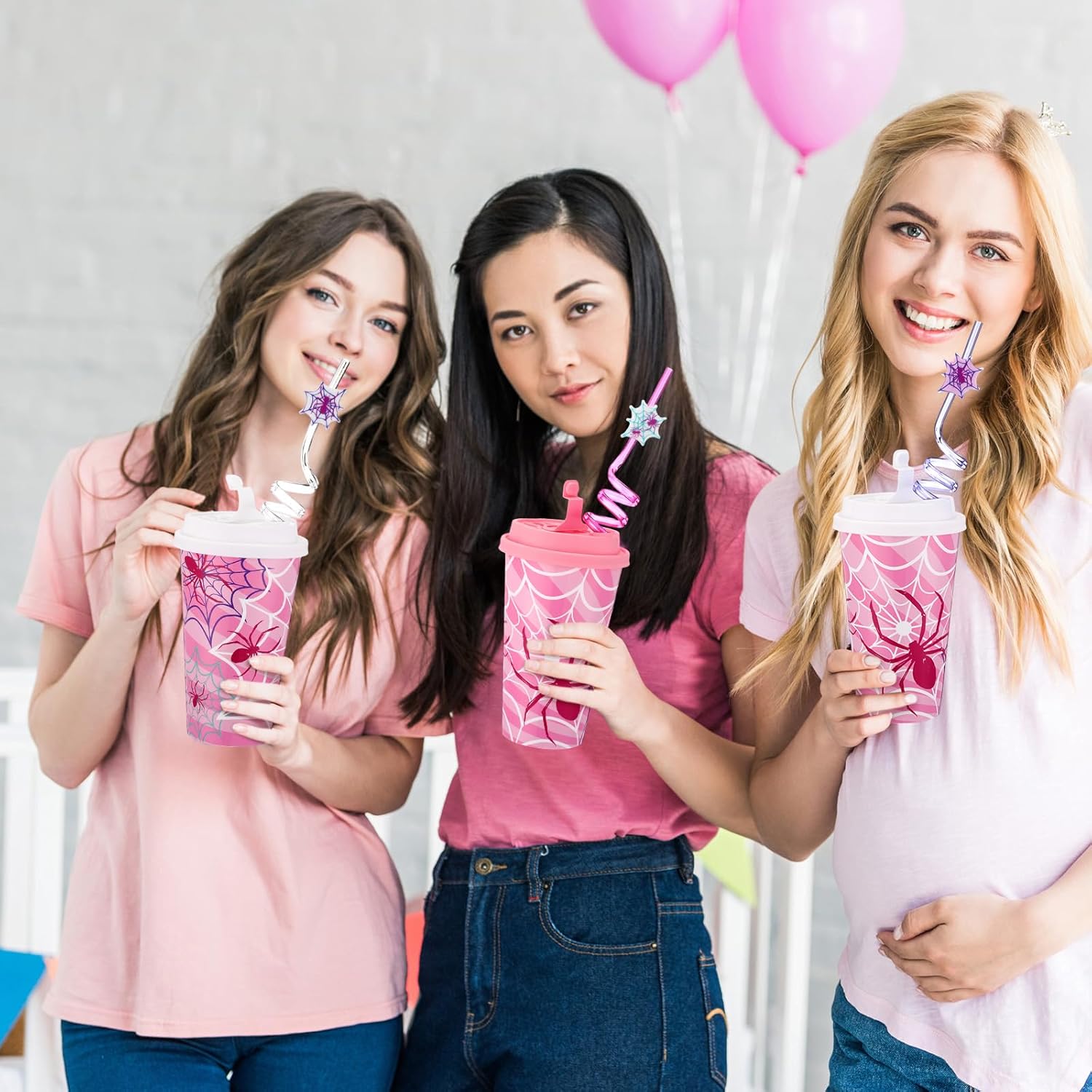 - Abundant Pink Spider Party Favors: revel in the charm of our spider birthday party supplies; Each package includes an ample amount of 24 pink spider cups for birthday party with pink and white lids, and 24 spider straws; Enjoy the fun filled festivities and step into the world of spider