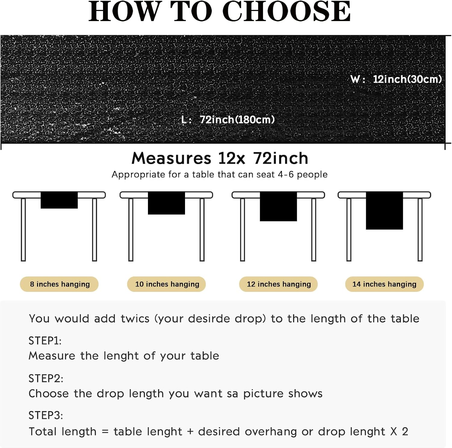 - Package Include: Each sequin table runner measures 12" x 72", total 10 pieces, perfect for a table that seat 4-6 people. The sequin table runner is appropriate for rectangle or round tables.