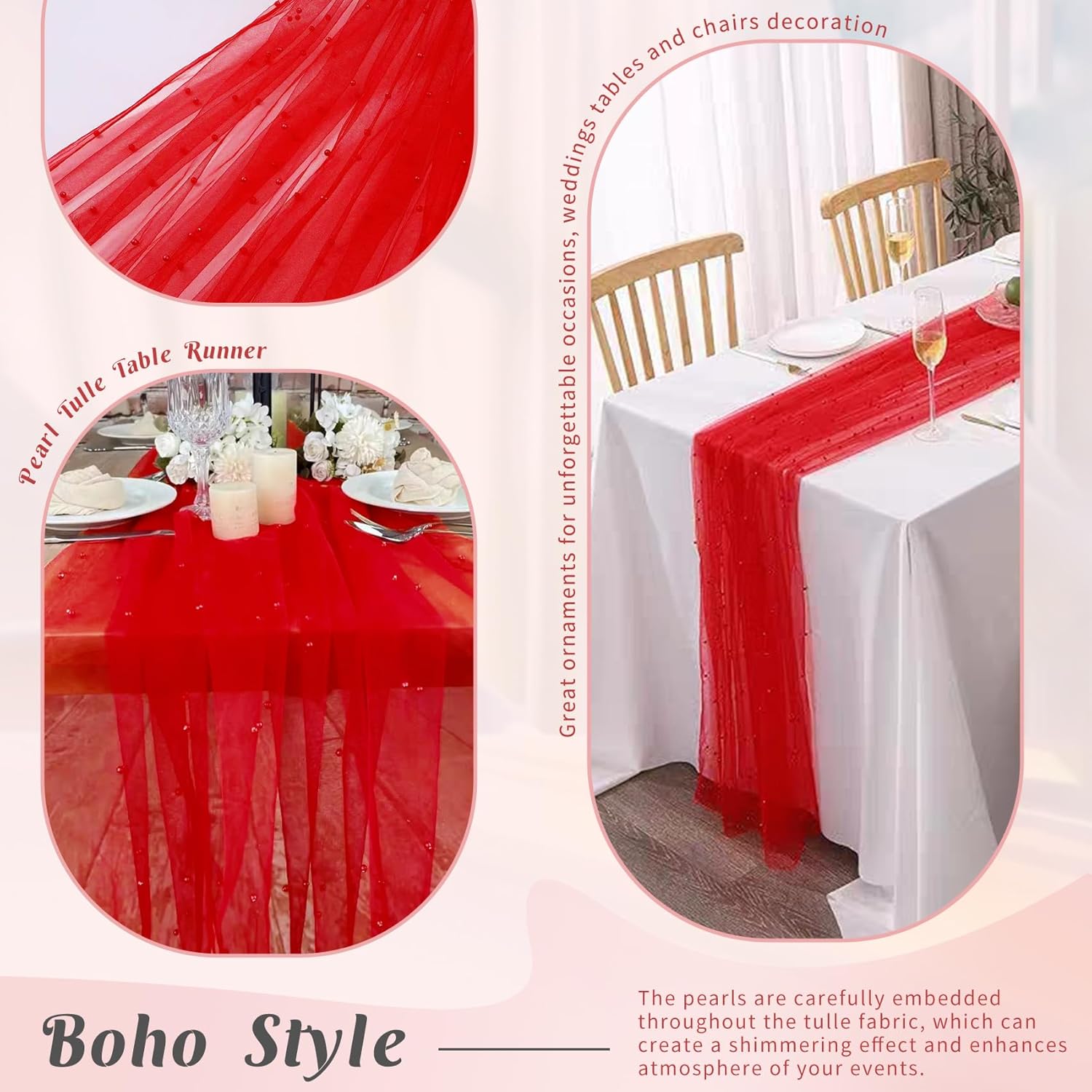- 【Exquisite Workmanship】 These romantic table runners are made of premium tulle. Soft feeling, sheer, reusable, easy to clean and fade resistant. Delicate pearls embellished table runner works perfectly for many types of event decor, which will add a ton of elegance to any space.