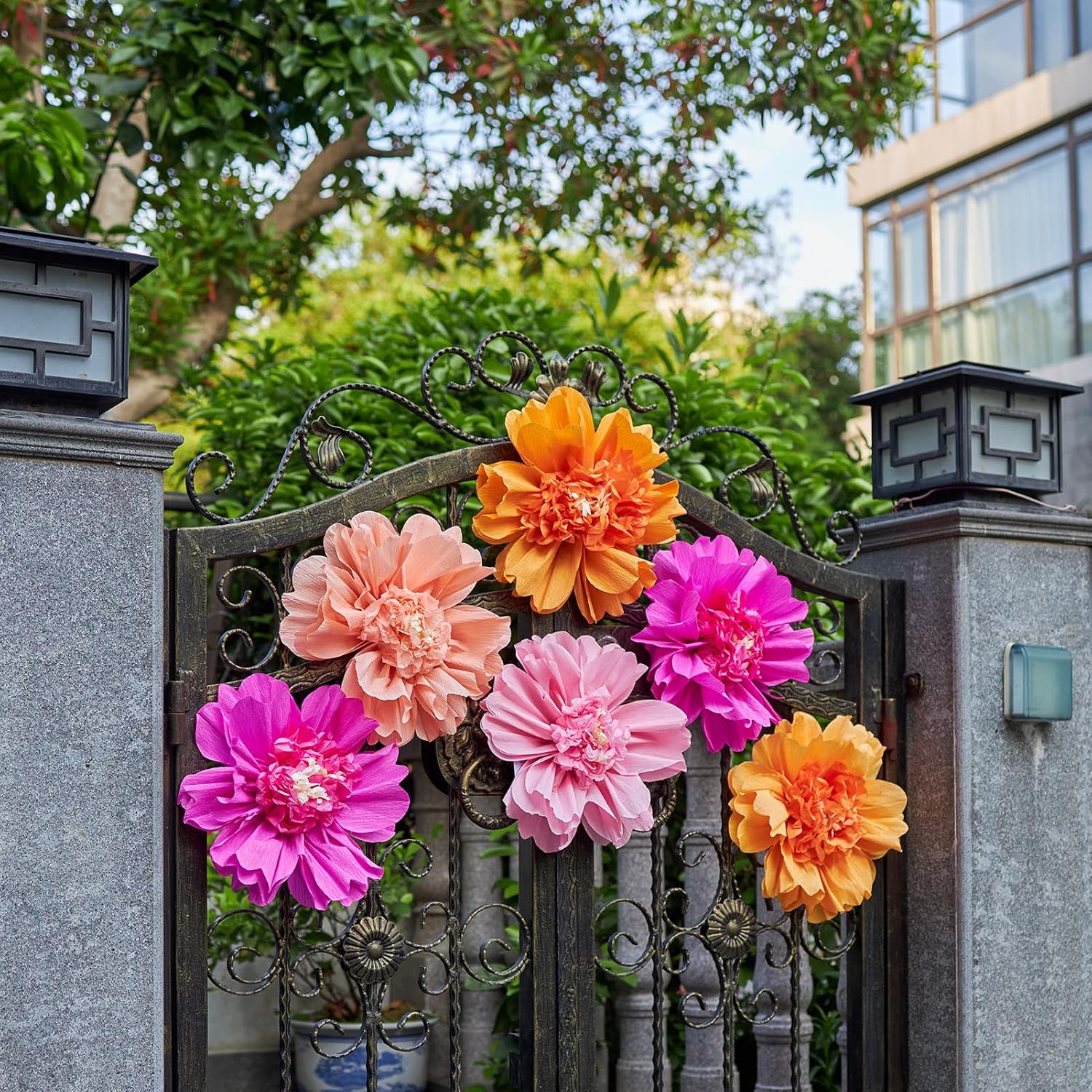 - đșăCOMPLETE FLORAL DECORATIONS SETă: This giant paper flower set includes 6 large paper flowers, offering everything you need to create a complete and vibrant floral display. Each bloom features 12-inch crepe paper petals with a layered tissue paper center in a mix of hot pink, pink, peach, and orange.