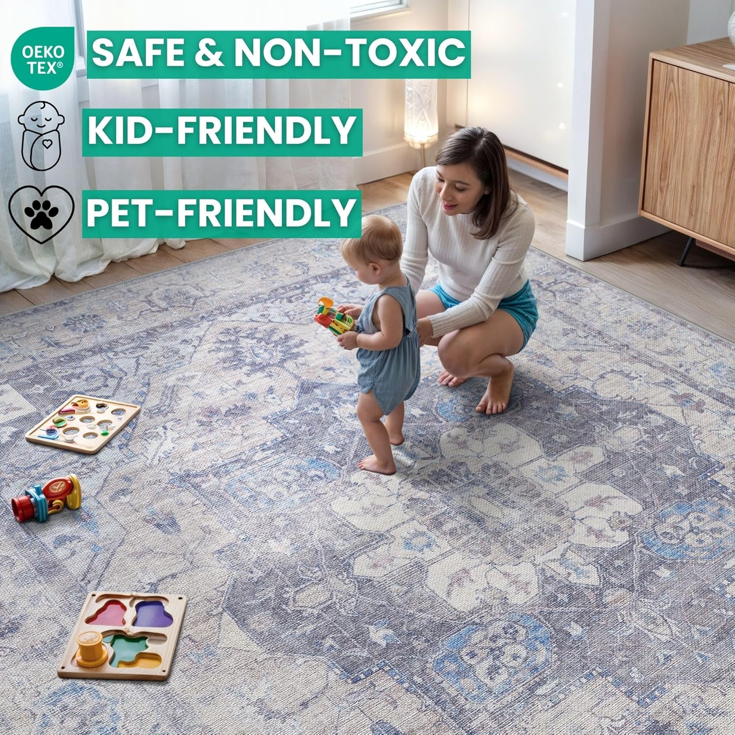 - MACHINE WASHABLE: Machine wash on delicate cycle (do not use bleach) at 85°F (30°C) and line dry or dry on air-only cycle without heat. Vacuum regularly and spot clean small stains. This easy to clean rug is perfect for families with kids and pets, and for high traffic areas.