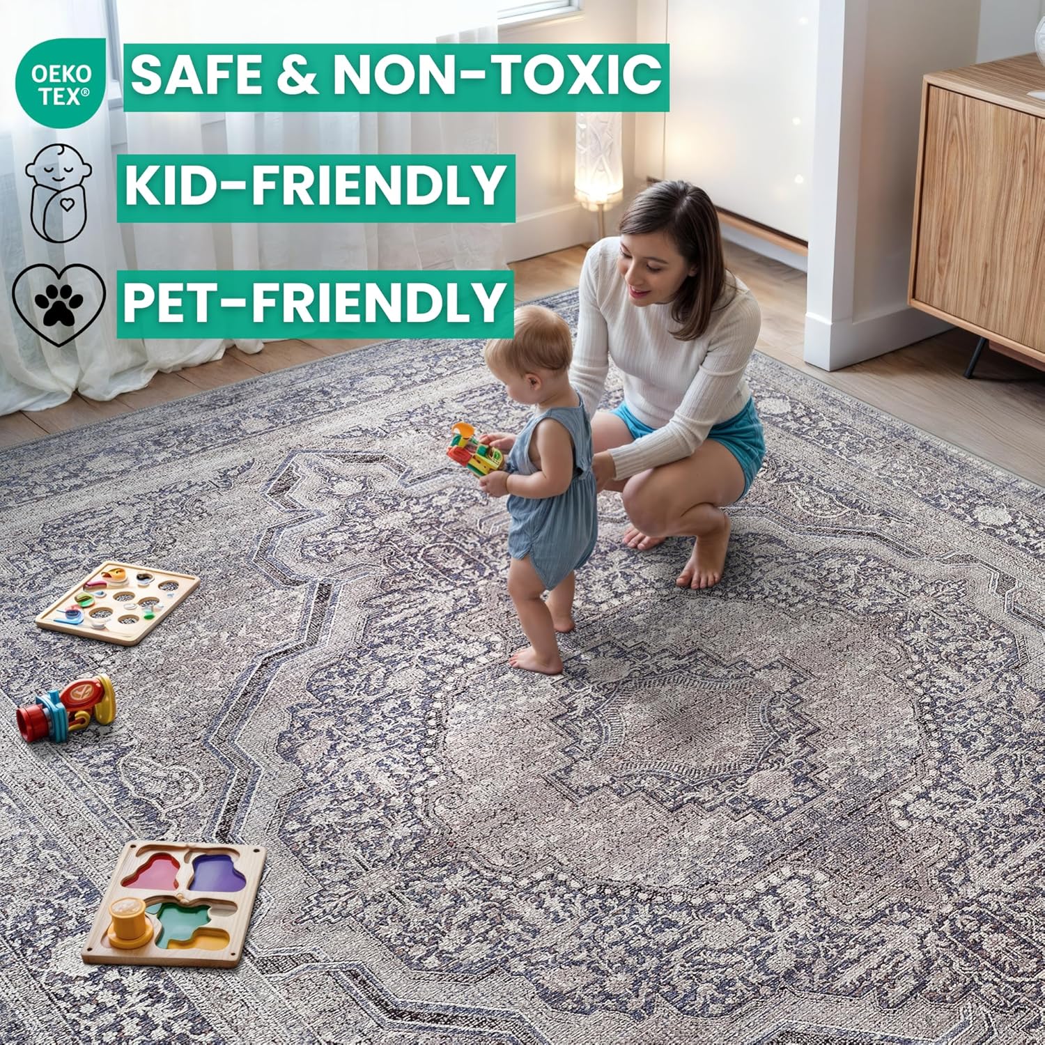 - MACHINE WASHABLE: Machine wash on delicate cycle (do not use bleach) at 85°F (30°C) and line dry or dry on air-only cycle without heat. Vacuum regularly and spot clean small stains. This easy to clean rug is perfect for families with kids and pets, and for high traffic areas.