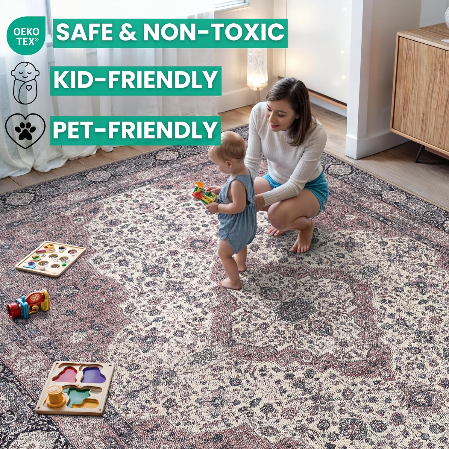 - MACHINE WASHABLE: Machine wash on delicate cycle (do not use bleach) at 85°F (30°C) and line dry or dry on air-only cycle without heat. Vacuum regularly and spot clean small stains. This easy to clean rug is perfect for families with kids and pets, and for high traffic areas.