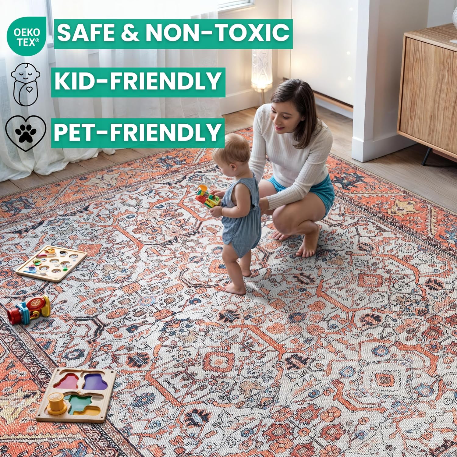 - EASY TO SETUP AND NON-SLIP: This one-piece machine washable rug with non-slip backing attached eliminates any additional setup. Simply unfold and lay flat upon arrival in the desired space. Non-slip backing prevents the rug from moving or sliding without the need for additional rug pad or grippers.