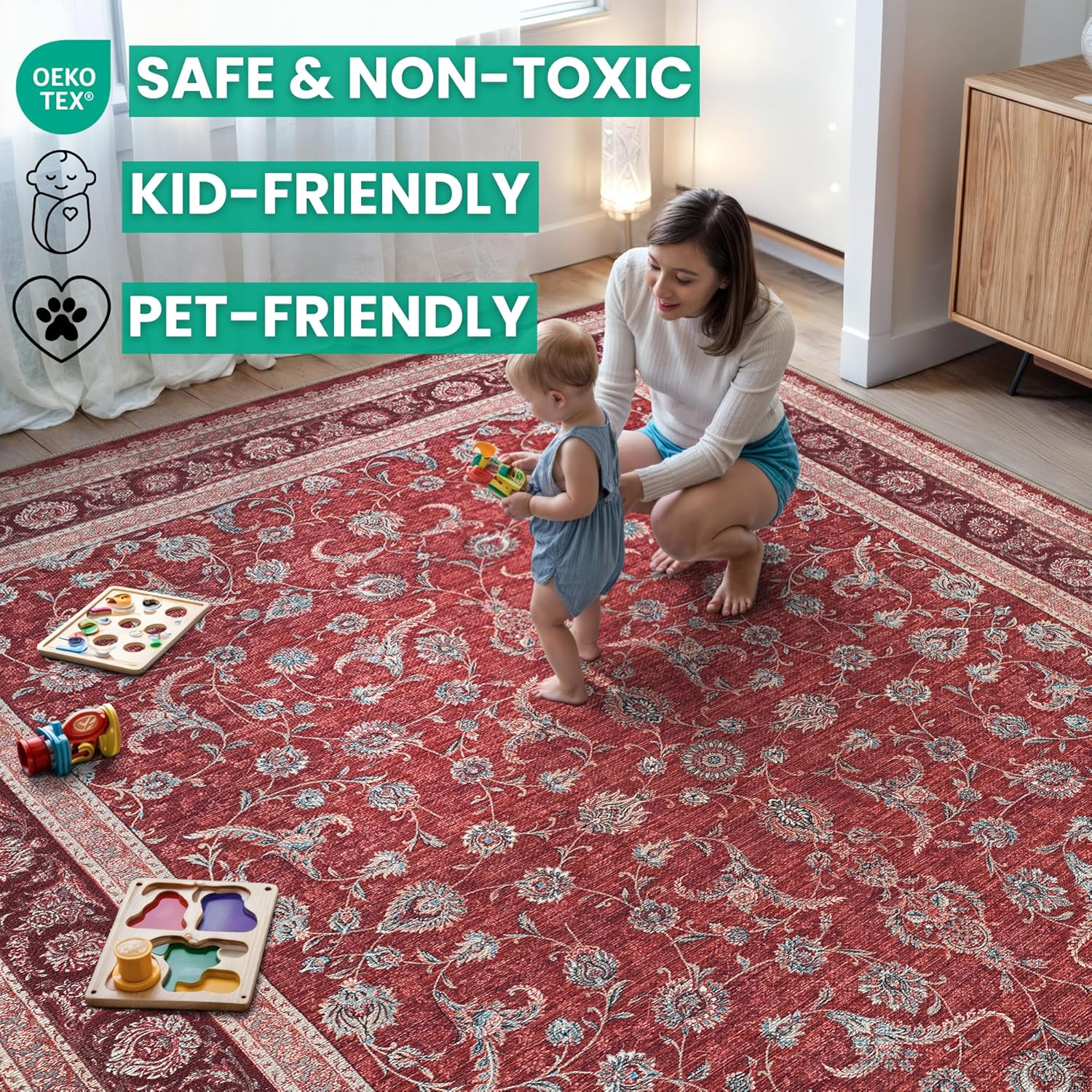 Bloom Rugs Washable Non-Slip 8' x 10' Rug - Red/Beige Traditional Bordered Area Rug for Living Room, Bedroom, Dining Room, and Kitchen - Exact Size: 8' x 10'