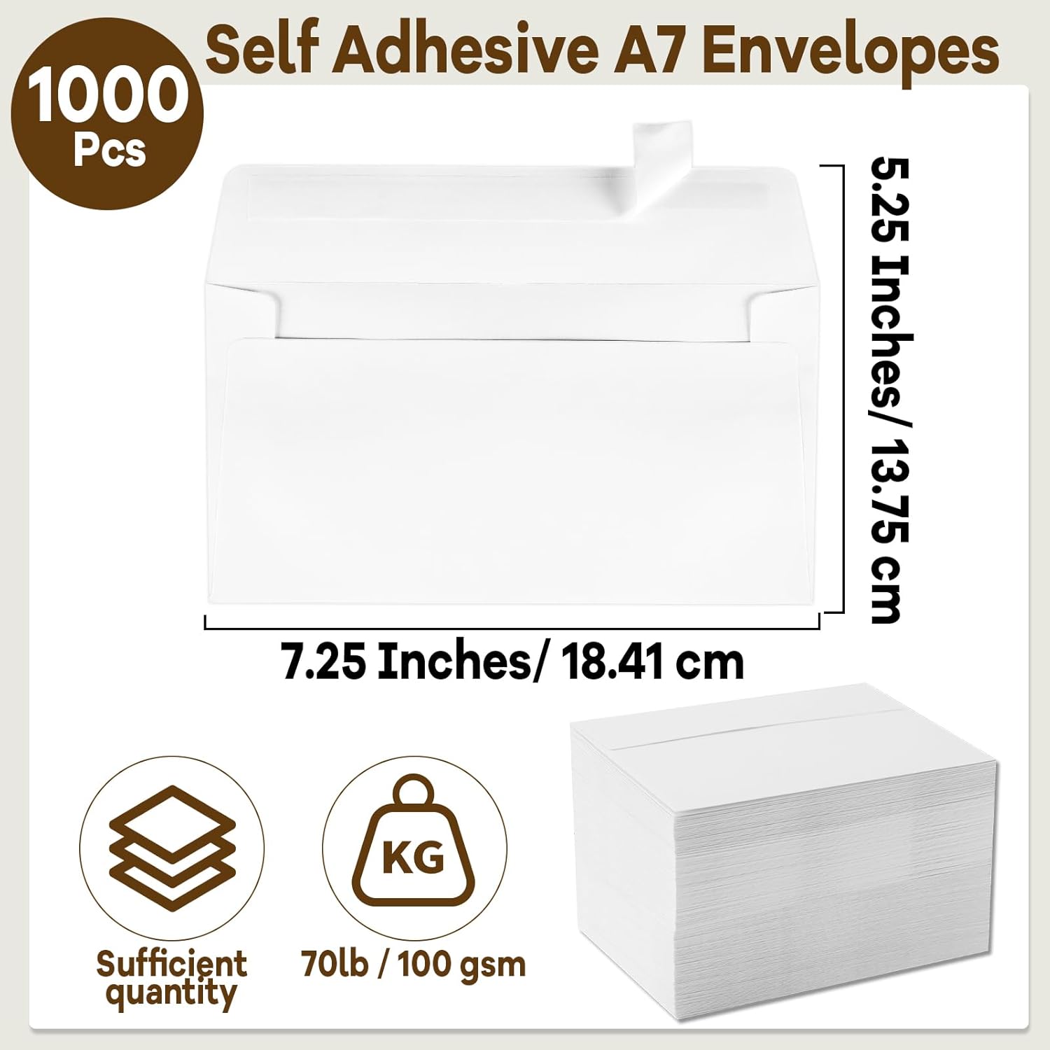 - A7 Envelopes Bulk: Come with 1000 pieces of 5x7 envelopes. And each self adhesive A7 envelopes measure 5.25x7.25/13.75x18.41cm. The enough quantity can meet your daily use needs. Ideal for office, small business.
