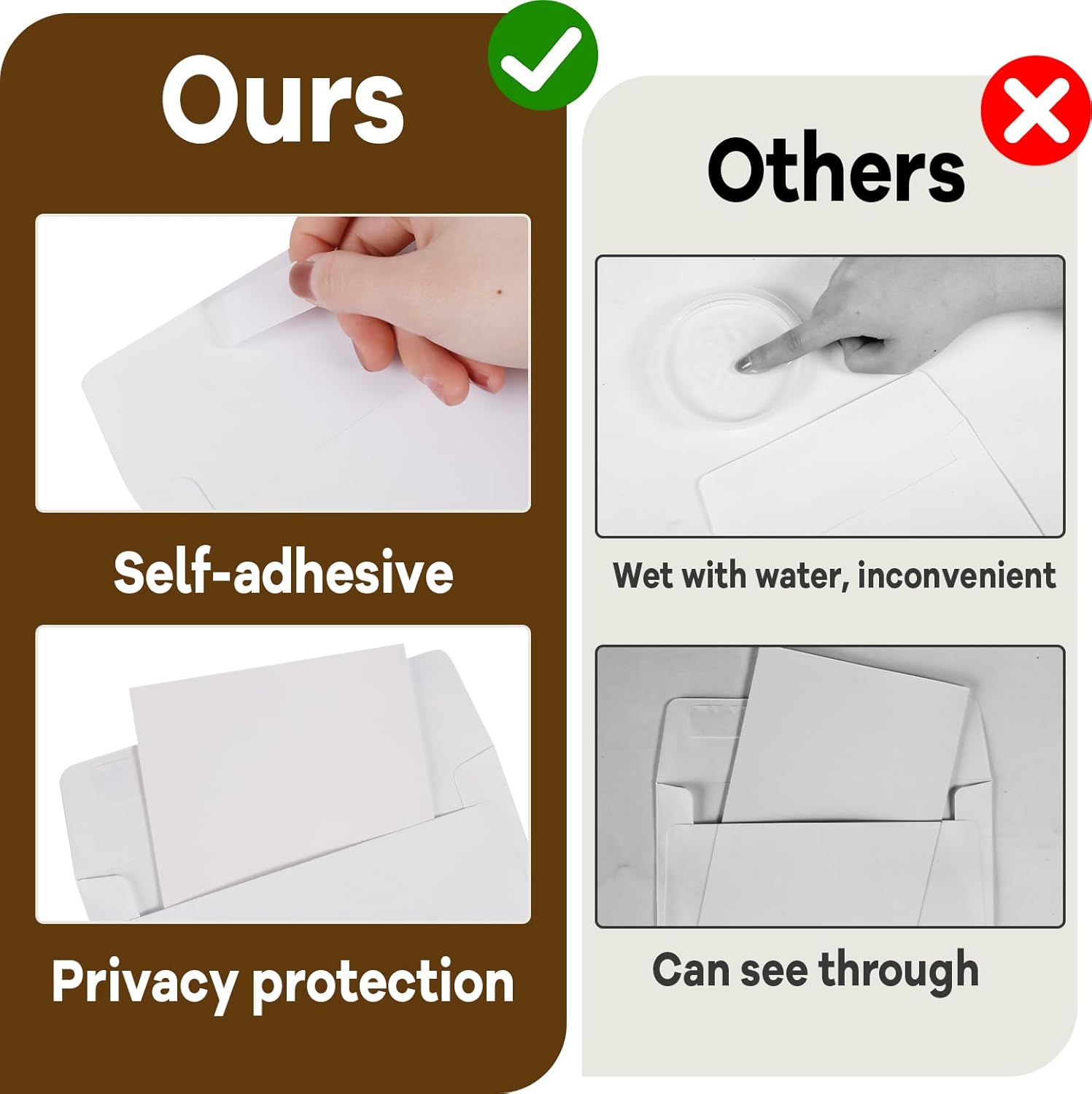 - Envelopes for 5x7 Cards: The 5x7 white envelopes have a pull strip adhesive seal which works great, no more an adhesive stick, and these peel and seal envelopes make it easy to security seal your contents.
