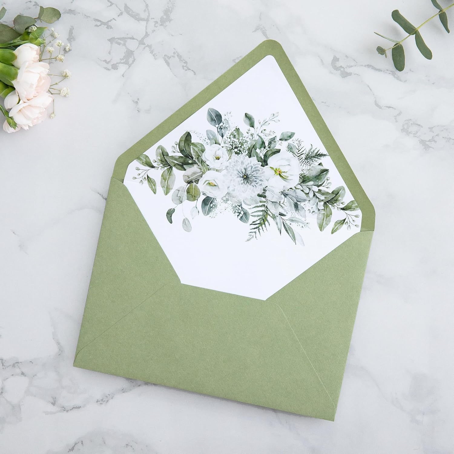 PONATIA 50PCS A7 Euro Flap Envelopes, 5.25 x 7.25'' Sage Green Flowers Liner Envelope for Wedding Invitations, Photos, Postcards, Greeting Cards, Christmas Gift, Acrylic Mailing, 5 x 7 Envelopes