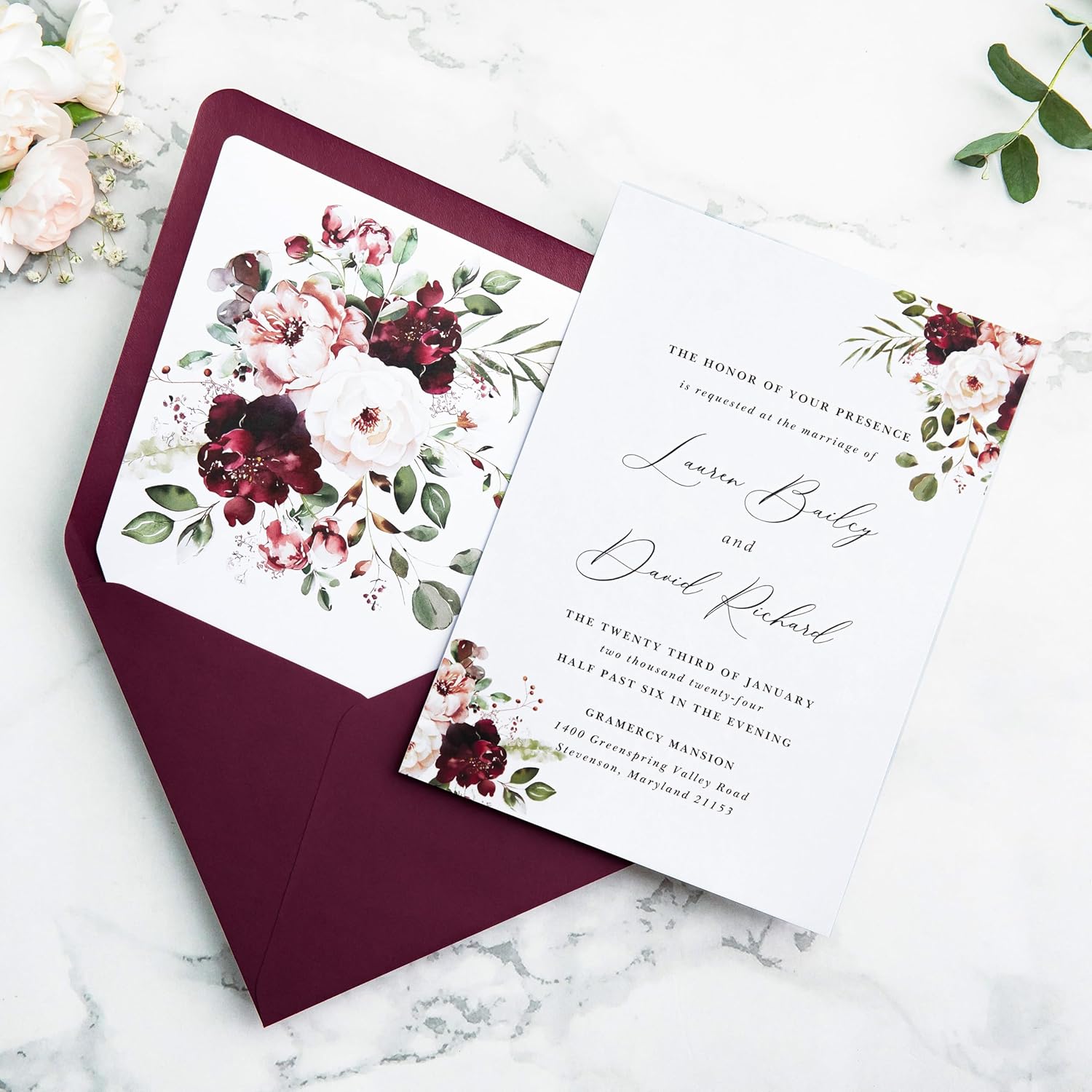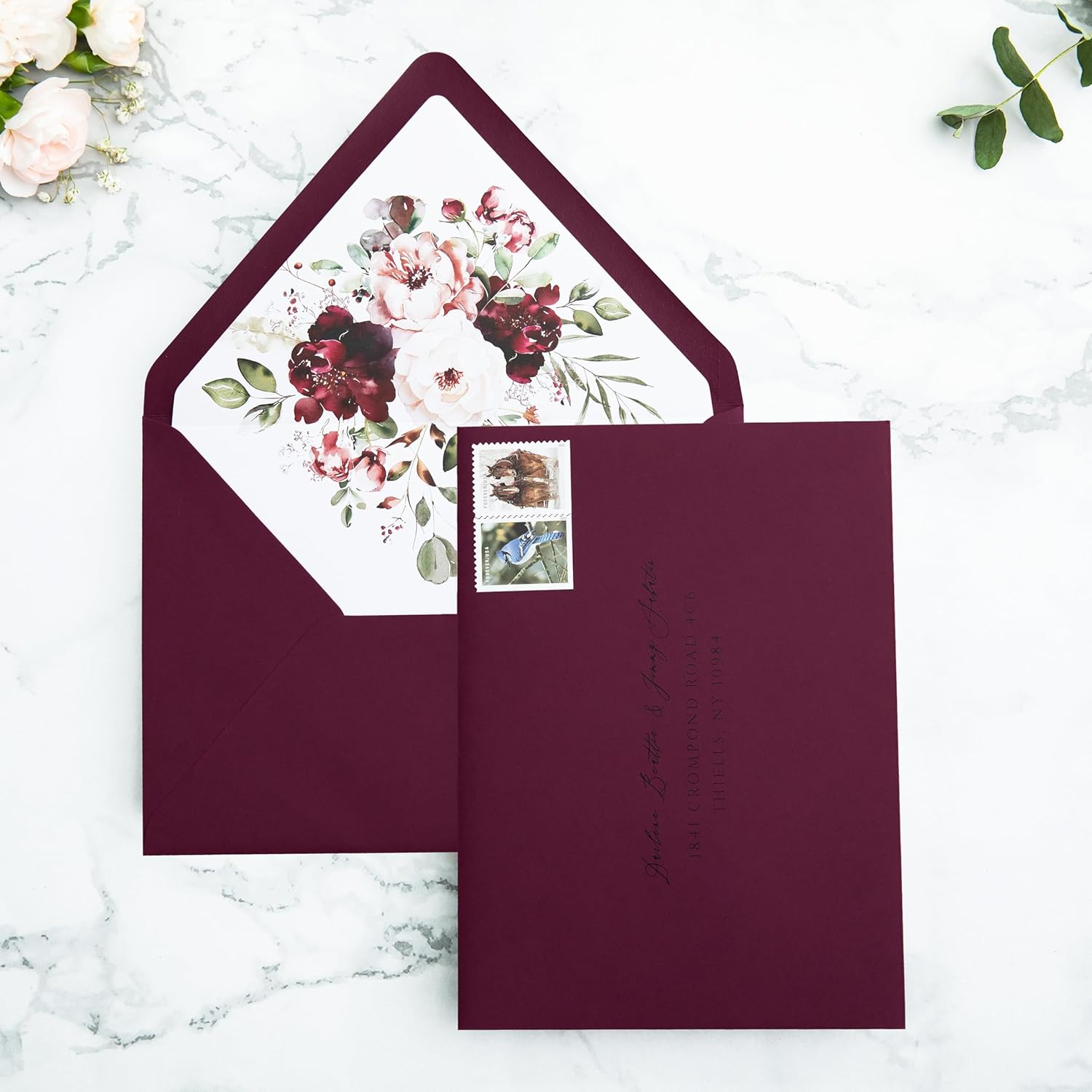 PONATIA 50PCS A7 Euro Flap Envelopes, 5.25 x 7.25'' Burgundy Flowers Liner Envelope for 5x7'' Wedding Invitation Cards, Christmas Gift Cards, Acrylic Invitations, Photos