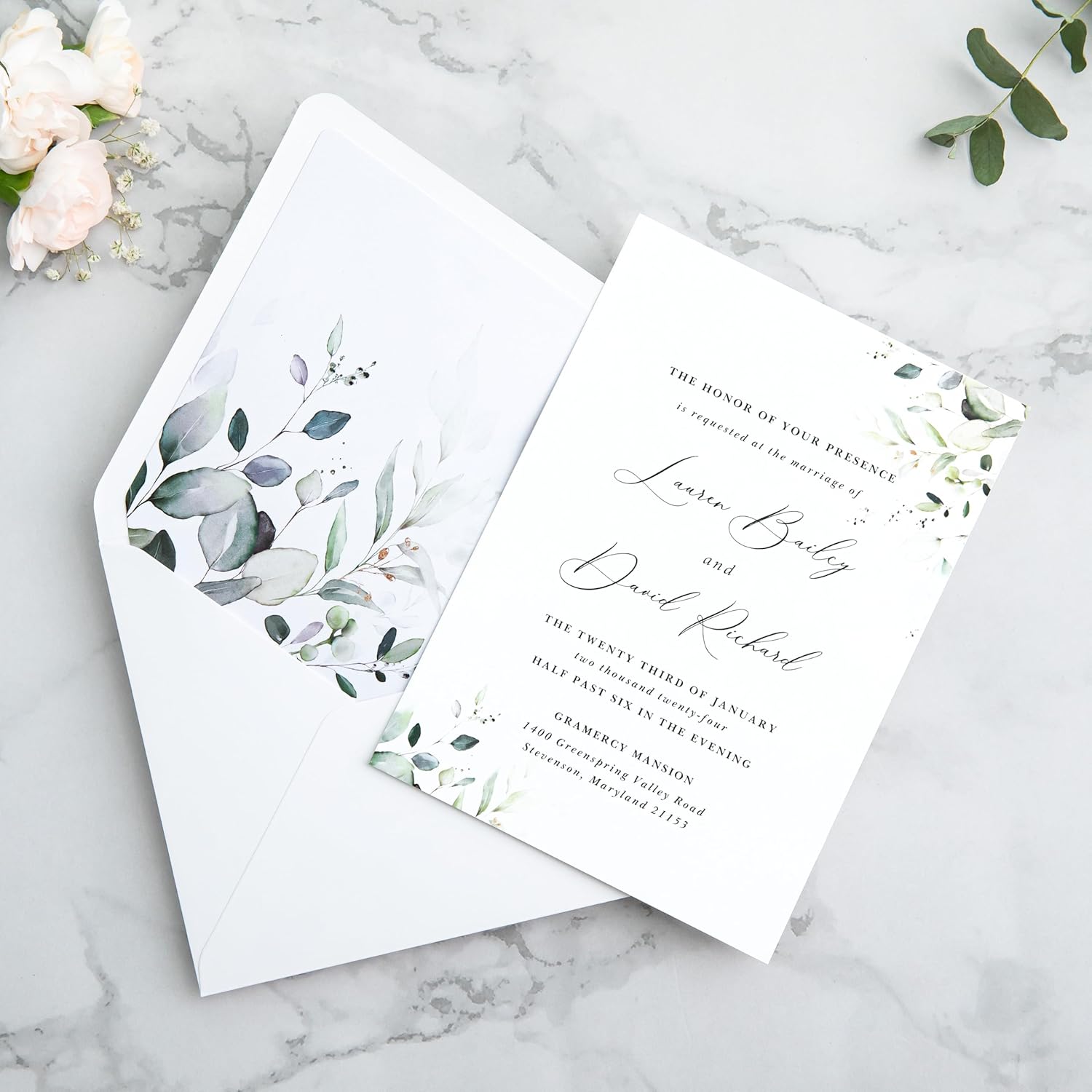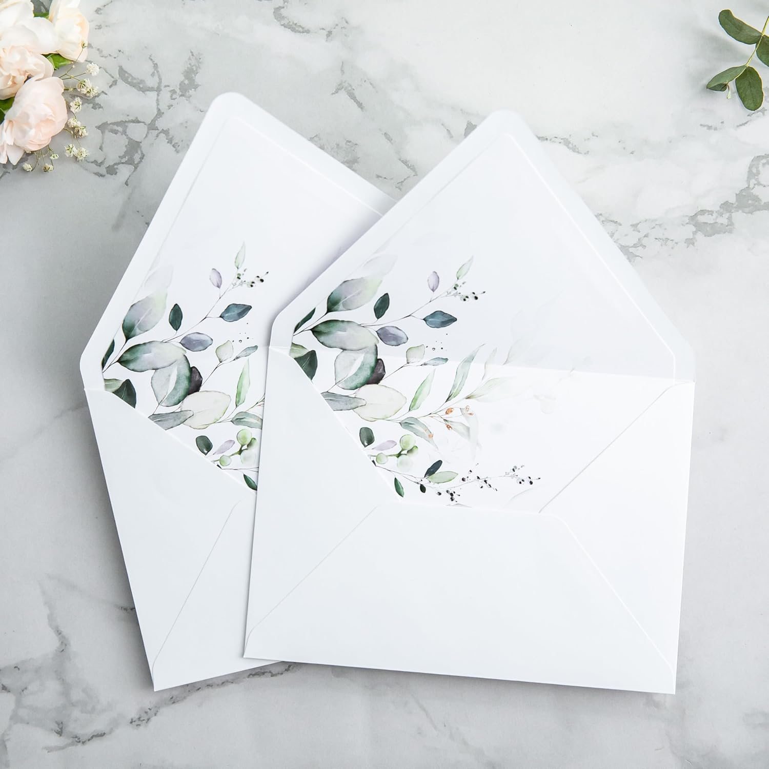 PONATIA 50PCS A7 Euro Flap Envelopes, 5.25 x 7.25'' Liner Envelope For 5x7'' Weddings Invitation Cards, Christmas Gift Cards, Acrylic Invitations, Photos (White & Sage Green Leaves)