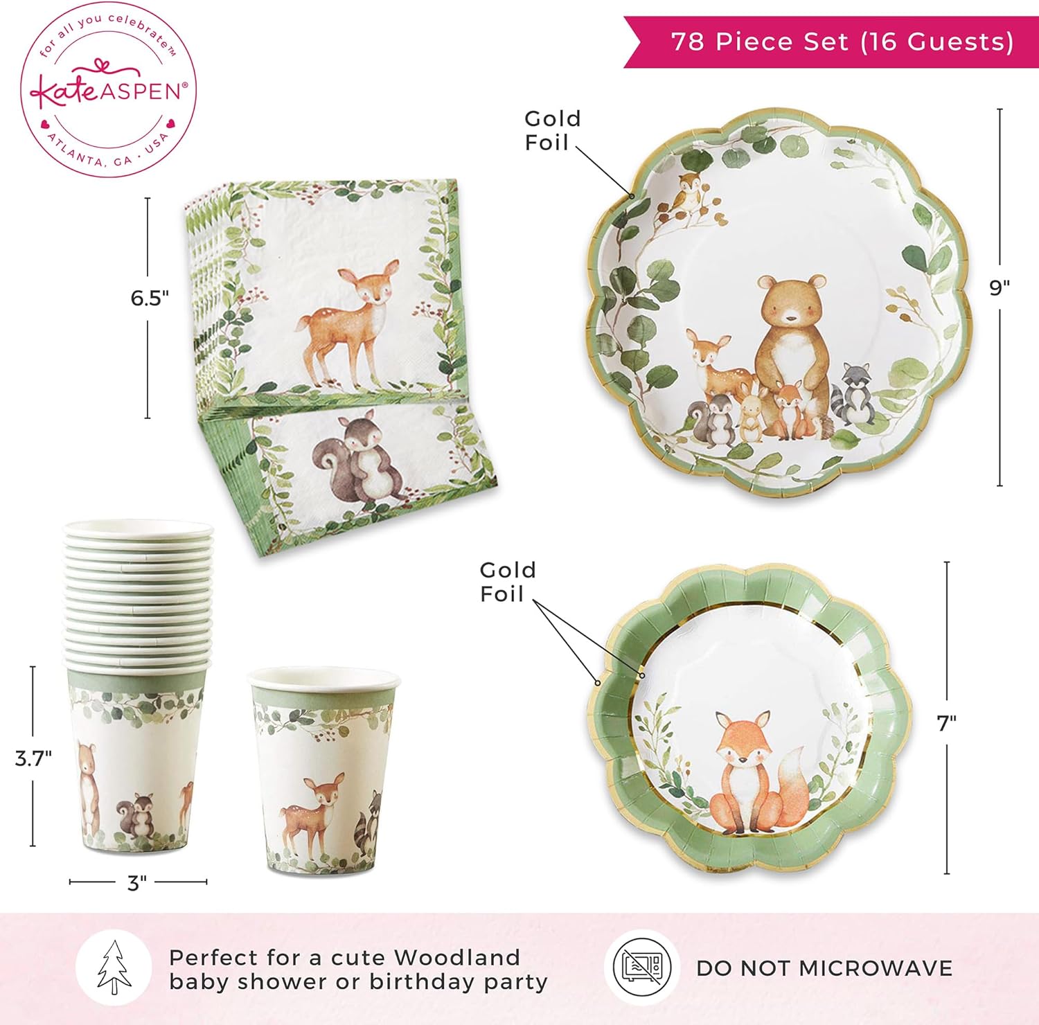 Kate Aspen Woodland Baby Shower Decorations - 78-Piece Baby Shower Plates and Napkins Set with Cups for 16 Guests - Gender Reveal Decorations Forest Animal Theme Party Supplies and Table Decor