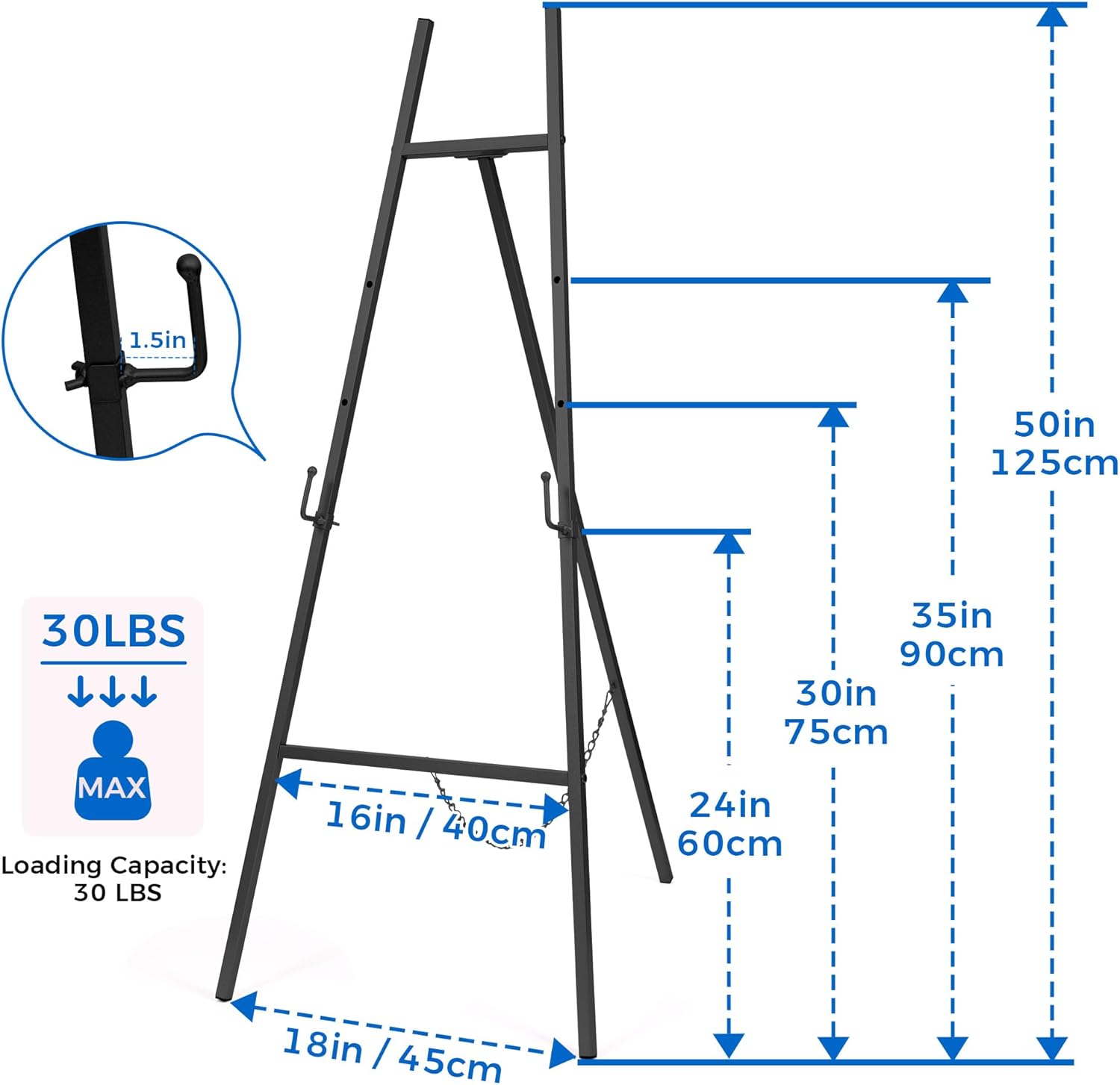 - [Adjustable And Versatile Design] With its tripod structure, our large easel offers adjustable height settings, making it versatile enough to display various sizes of wedding signs, artwork, or directional signs. Measuring 50H x 19L x 18W inches and weighing just 3.5 lbs, it’s easy to move, store, and sturdy enough to keep your displays or paintings secure.
