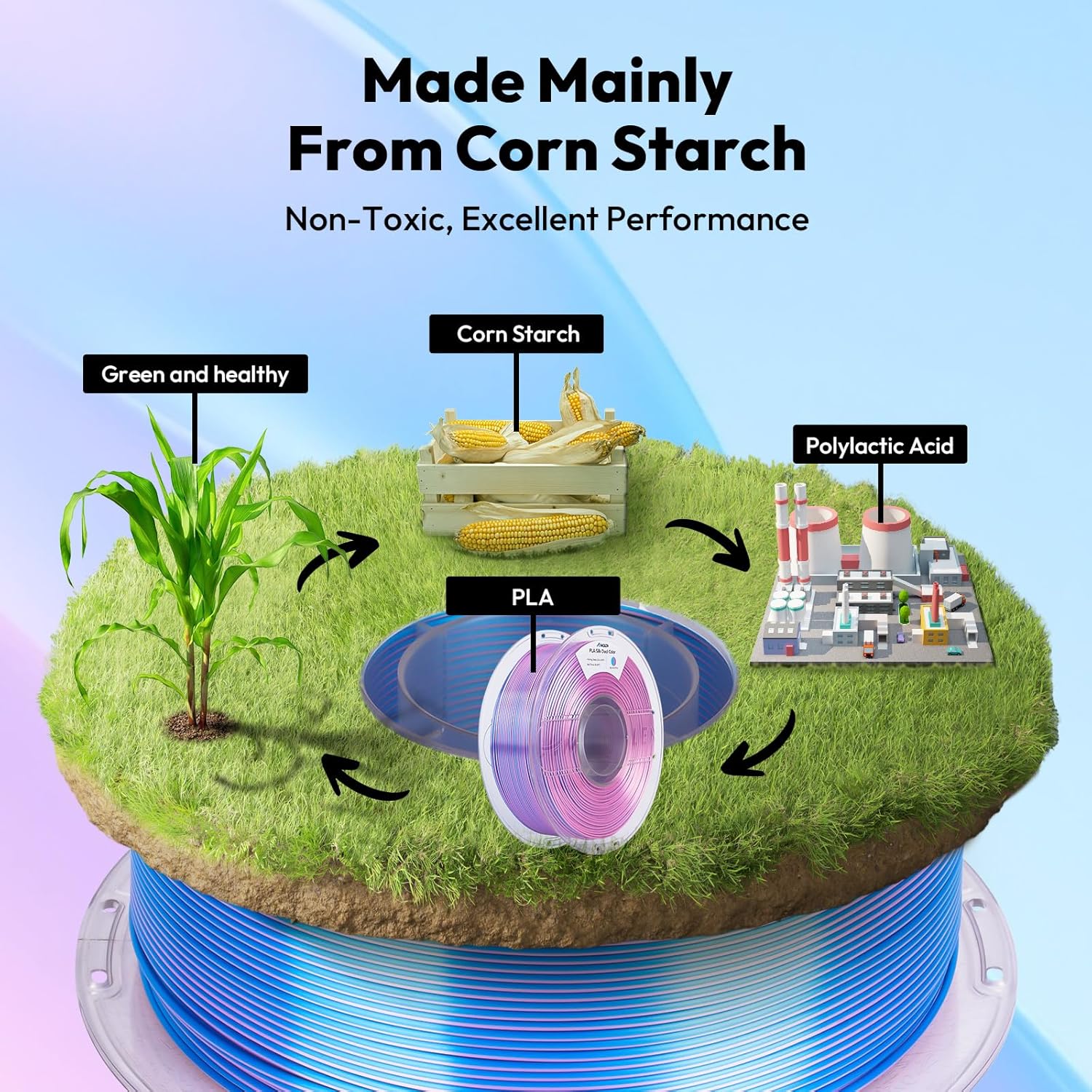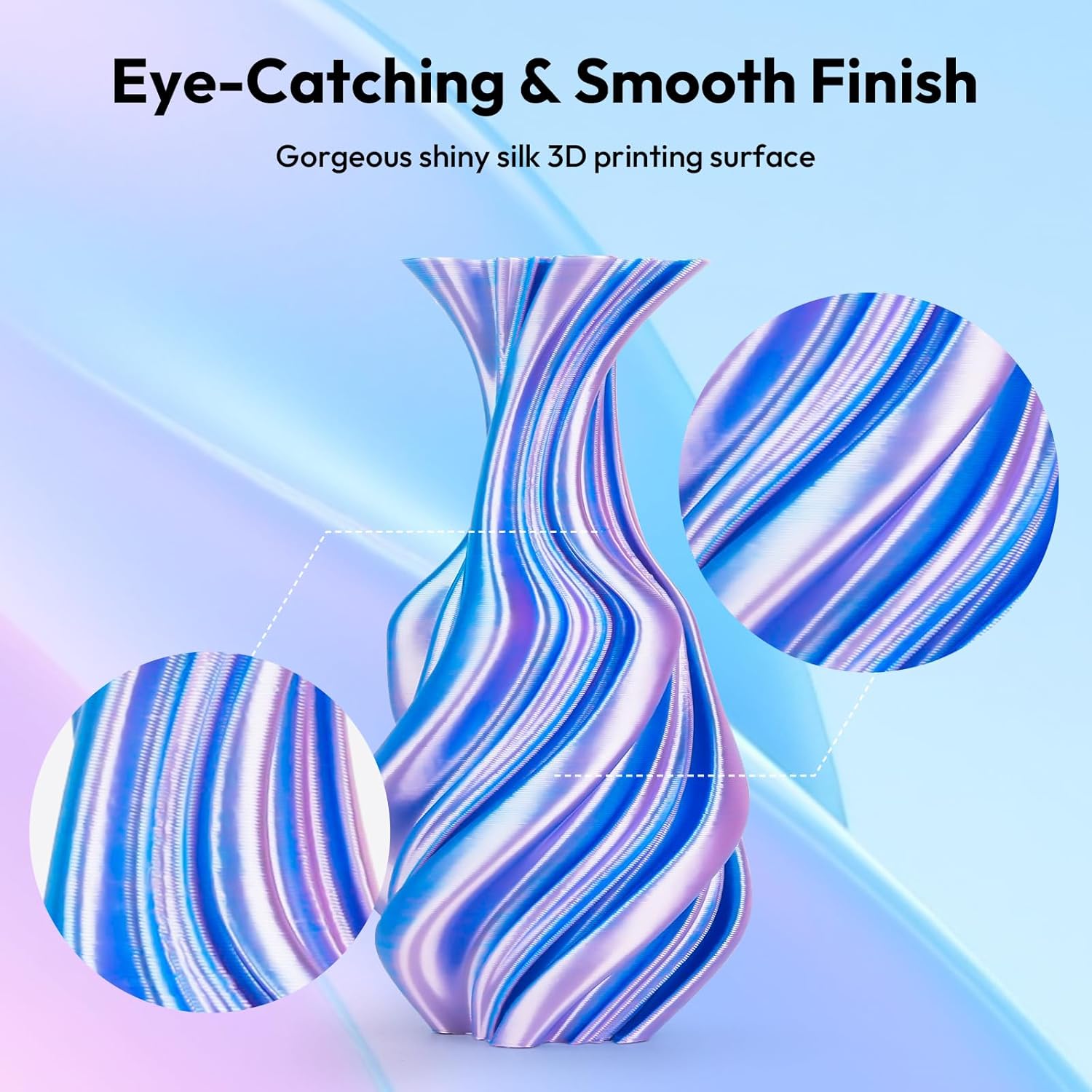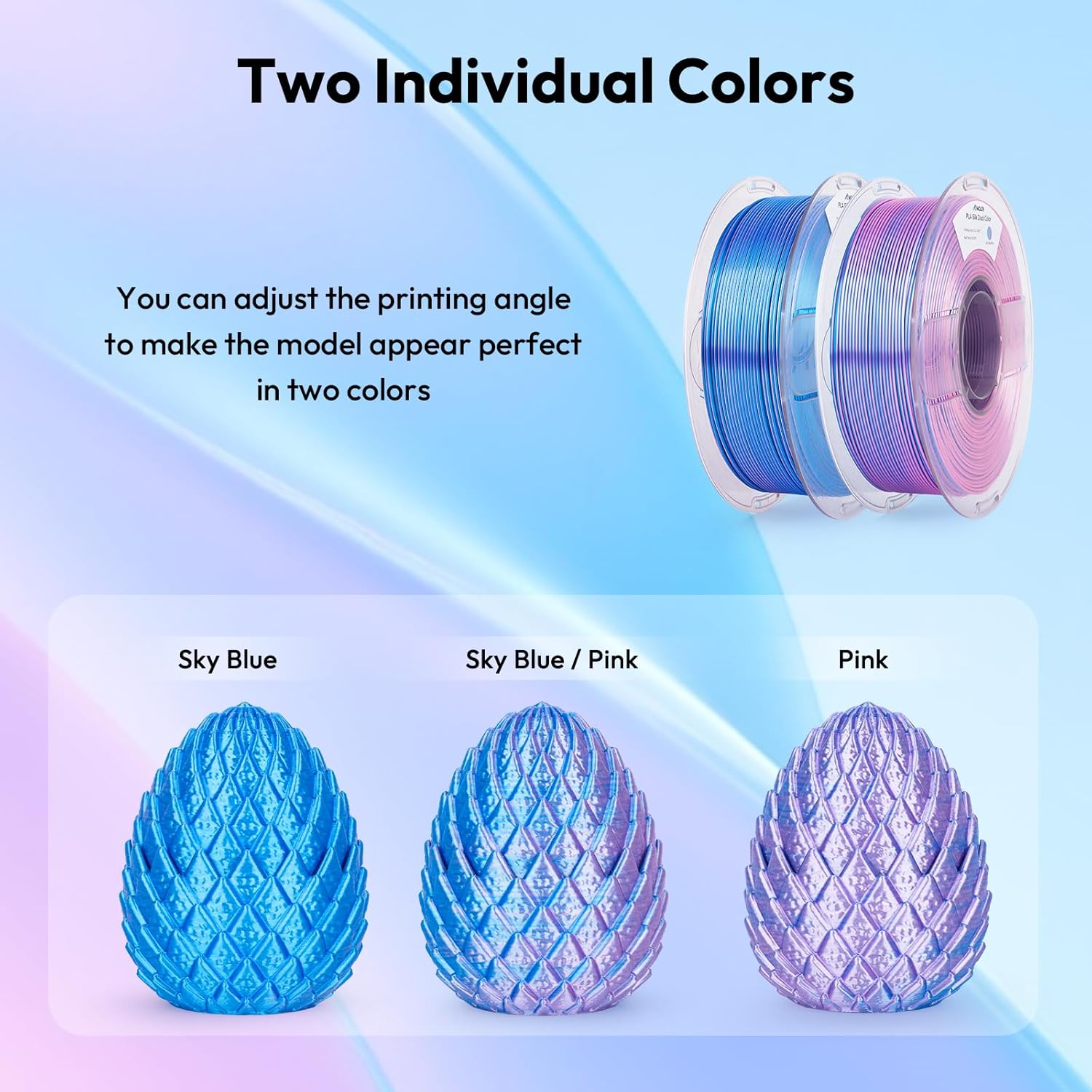 - Eye-catching Silk PLA: Shiny Sky Blue and Pink combination of magic 1.75mm PLA filament, make the two sides of your print appear in different colors. Without polishing, you can get a silk glossy and smooth 3d prints. Beginner & expert friendly, it’s your go-to for eye-catching designs all year round