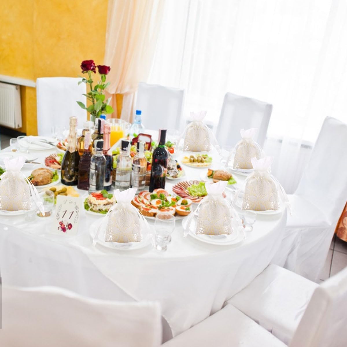 - ๐๐๐ฌMaterial:These lace gift pouch bags are made of snow yarn and cotton edge,lightweight,durable and washable.Can act as bags or candy bags for festival,wedding and party.