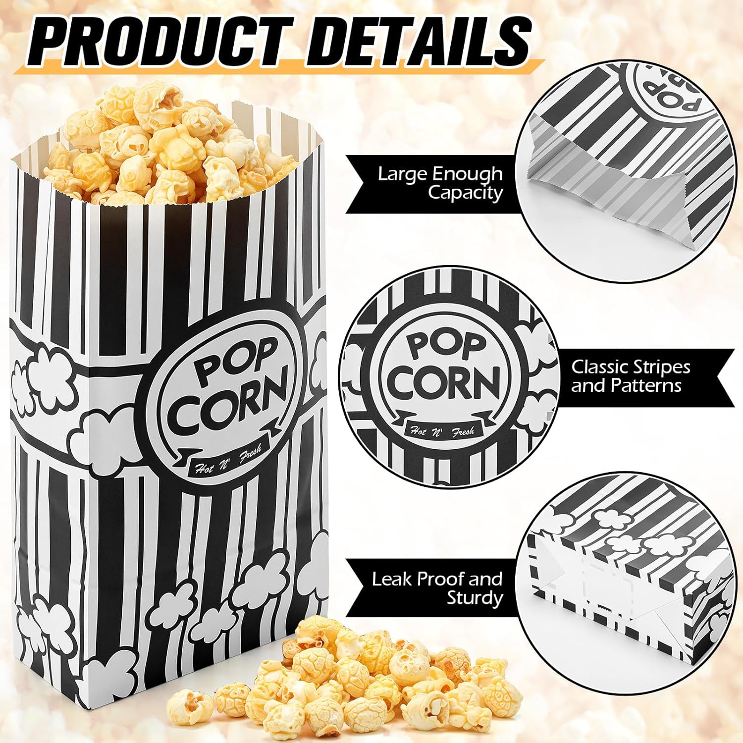 - Vintage and Resonant Appearances: the individual popcorn containers adopt classic black and white striped patterns and delicious popcorn patterns, which can arouse your childhood memories at first sight, creating a vintage and nostalgic atmosphere