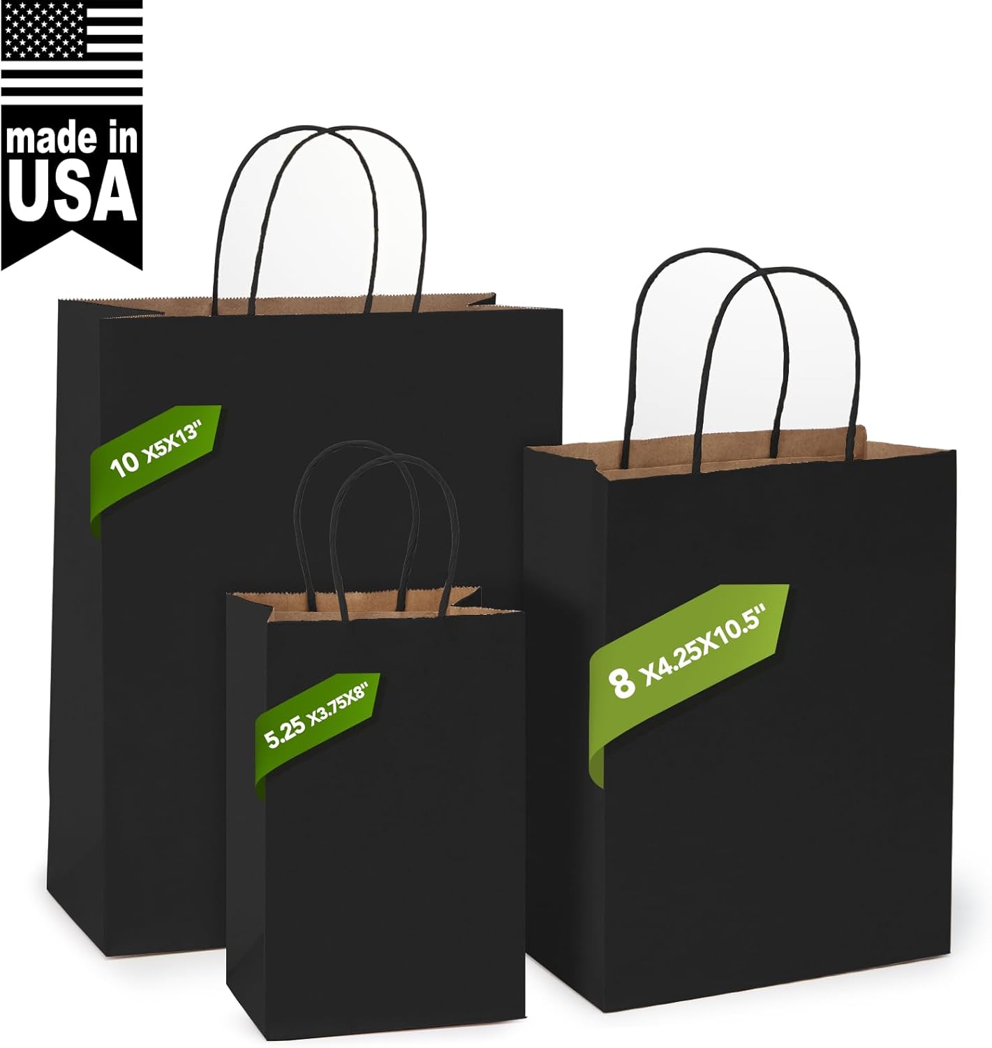 MESHA Gift Paper Bags 300 PACK 8x4.25x10.5'' Black Medium Shopping Kraft Bags Bulk with Handles Reusable for Business,Grocery,Birthday,Wedding,Kids Party,Favors