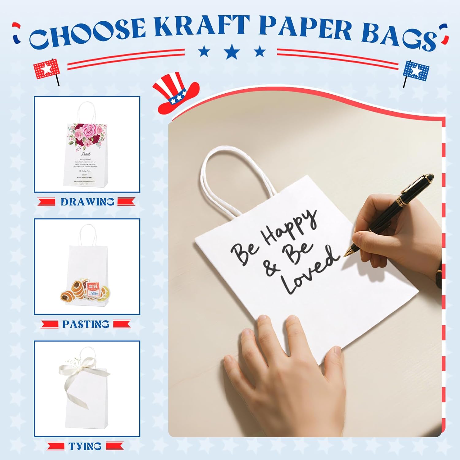 - DIY creativity - paper bag is blank, you can use painting, coloring and other ways to decorate it, as a gift bag for your guests in different festivals. In addition, as a retail bag for small businesses, you can also order your business card or print your trademark on the outside of the bag.
