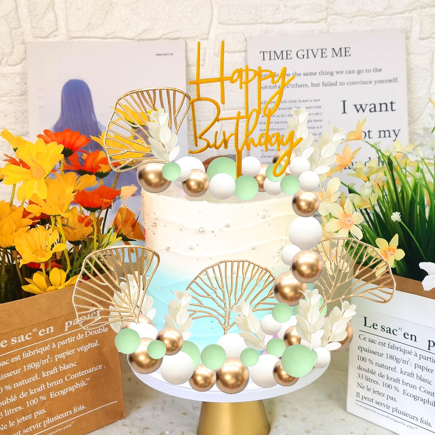 Gyufise 57Pcs Balls Cake Topper Boho Grass Cake topper Pearl Balls Acrylic Happy Birthday Cake Decorations for Wedding Baby Shower Birthday Boho Themed Party Supplies Green
