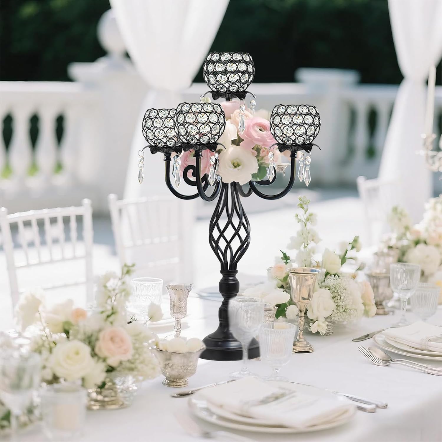 5-Arm Crystal Candelabra Centerpiece 23.2" Tall - Elegant Candle Holder Stand with Crystal Bowl, Chic Table Decor for Weddings, Parties, Anniversary & Home Decoration (2, Black)