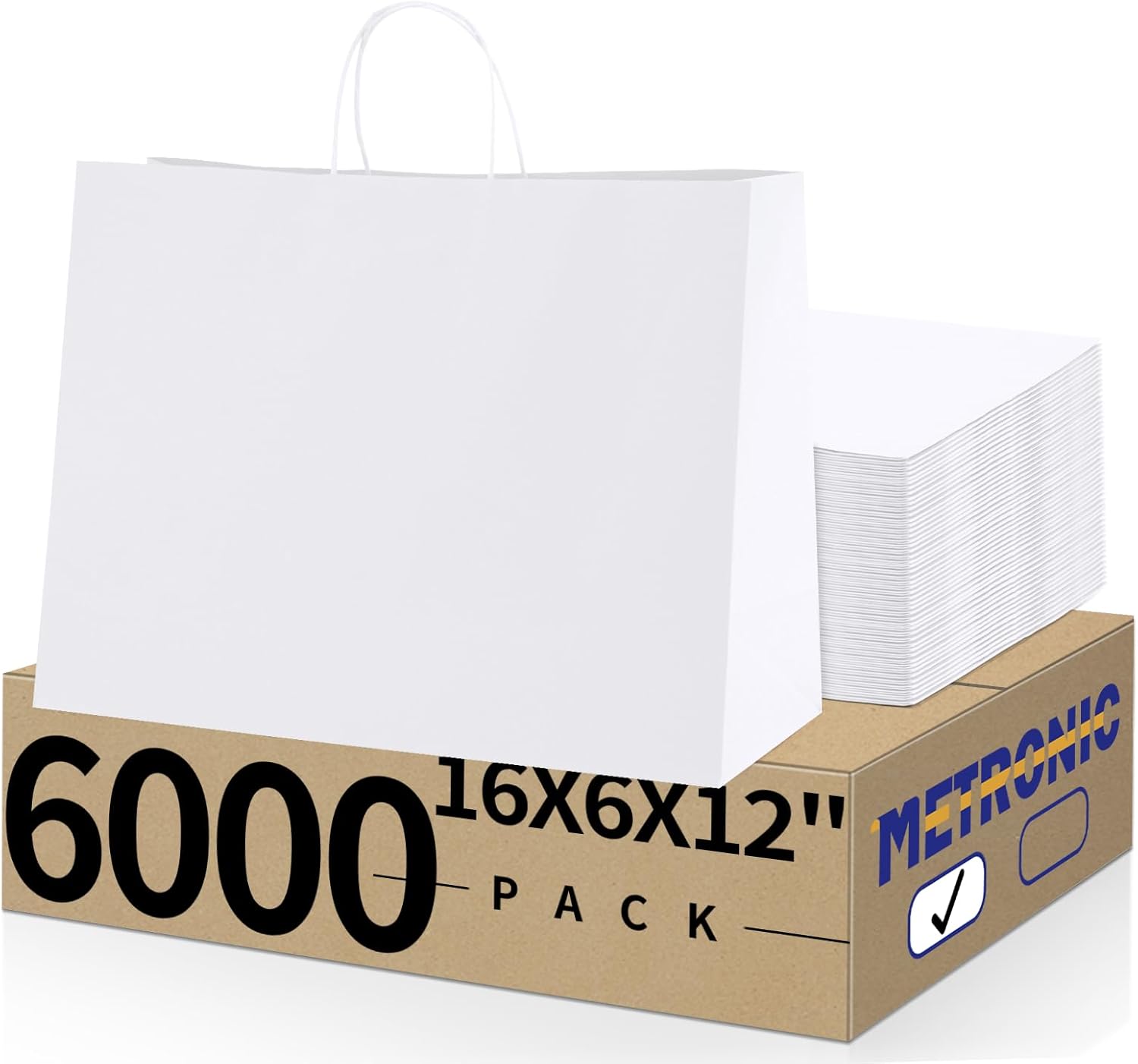 METRONIC Kraft Paper Gift Bags with Handles 16x6x12 Inch 6000 Pack | Christmas, Birthday Party Favors, Retail Shopping, Small Business Bulk | White Gift Wrap Bag