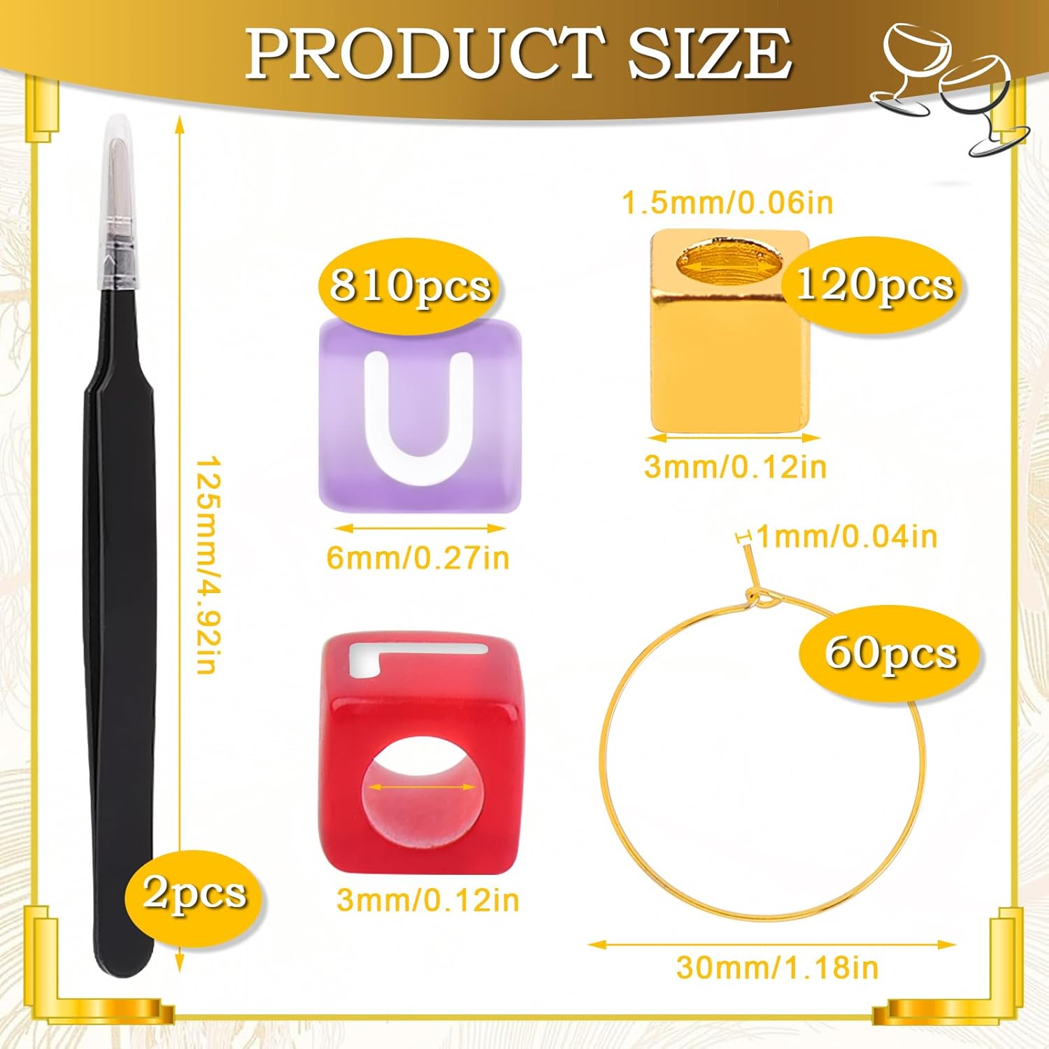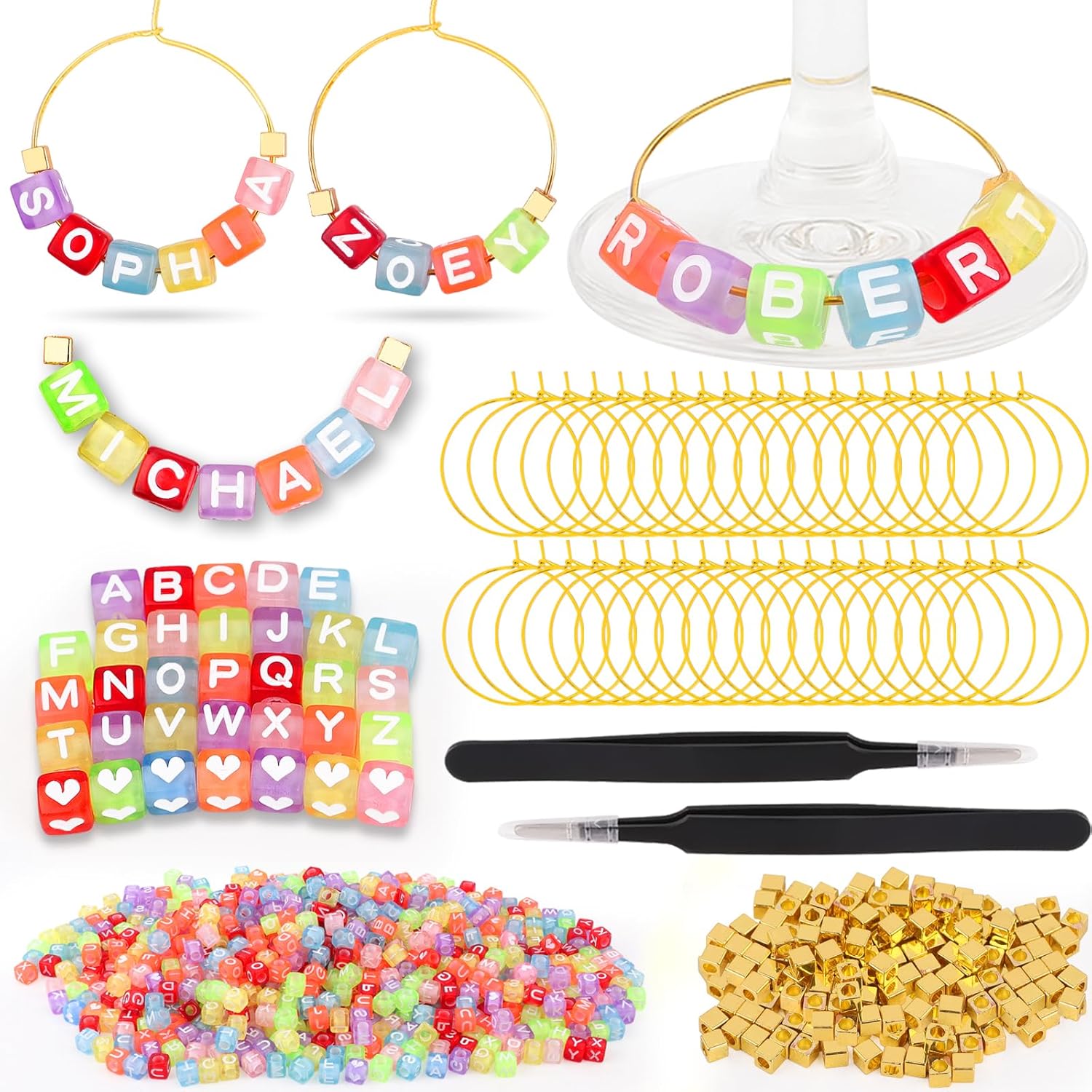 - ๐จ 810-Piece DIY Wine Charm Kit โ Everything Included. This all-in-one kit features 780 letter beads (30 of each AโZ), 30 heart beads, 120 gold spacers, 60 durable metal rings, and 2 precision tweezers. Spell names, initials, or party phrases without running out of lettersโno filler, no frustration.