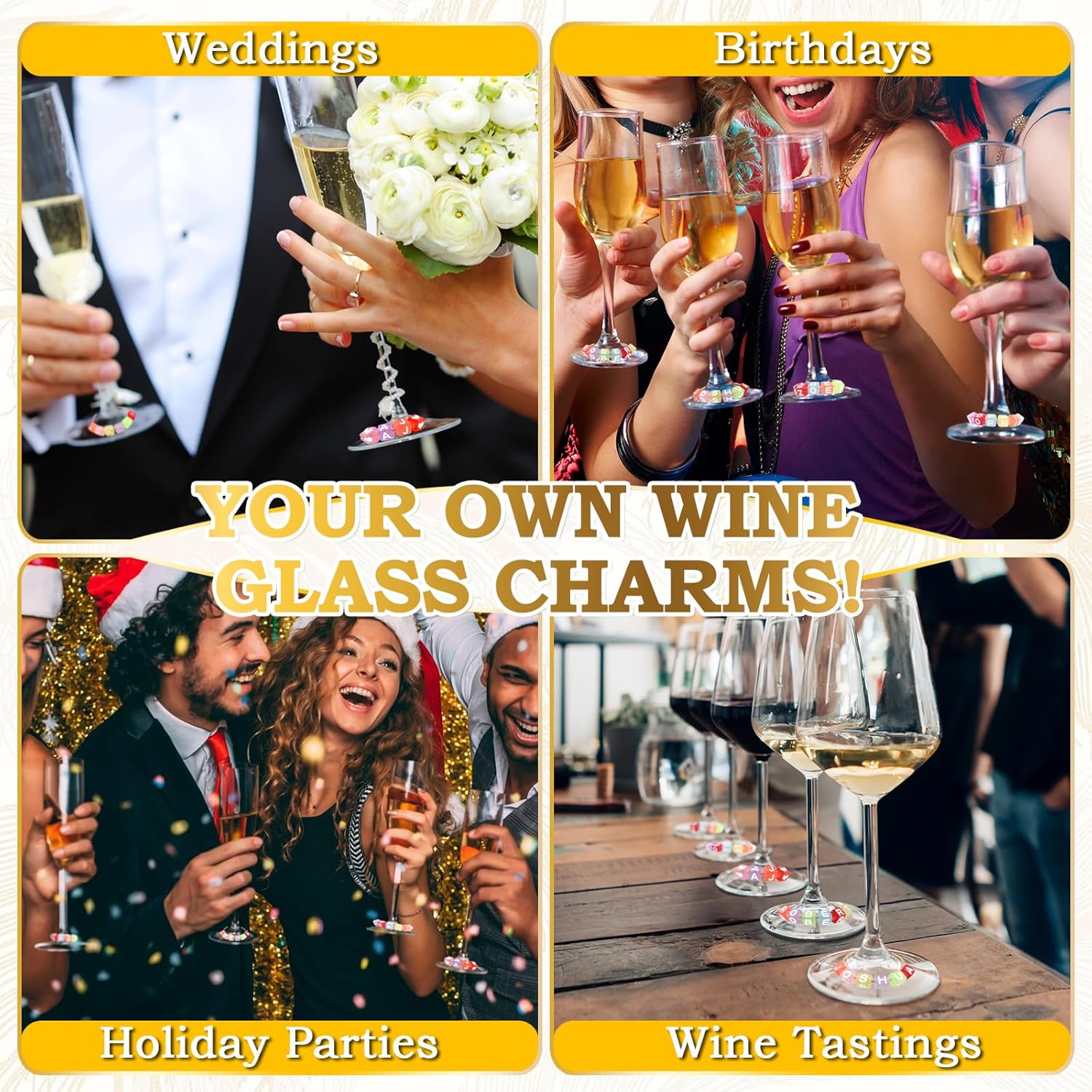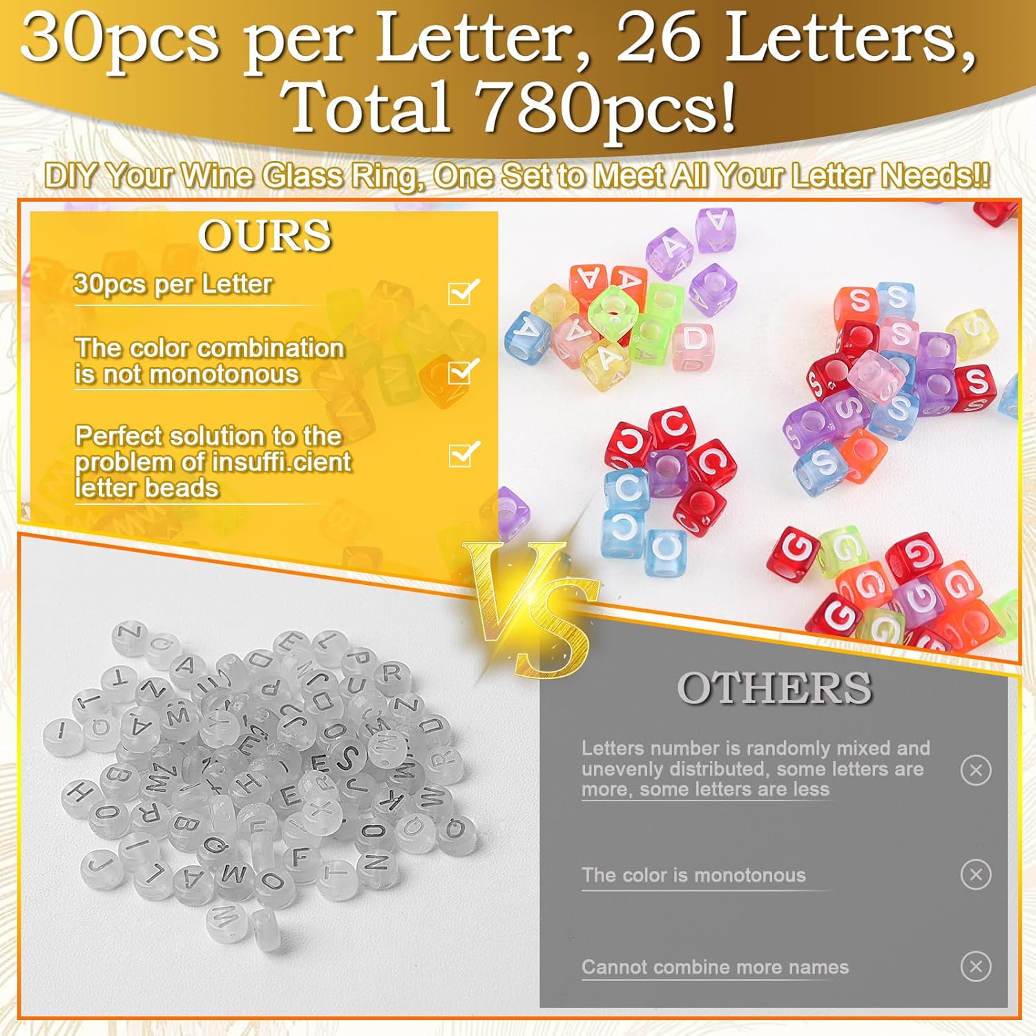 60 Sets DIY Wine Glass Charms โ 780 Letter Beads 120 Gold Beads 60 Charm Rings 2 Tweezers, Drink Identifier Charms Wine Glass Marker Tags for Wedding Cocktail Bachelorette Party Decoration (Square)