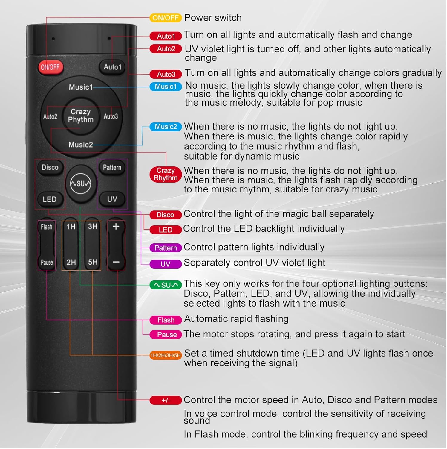 - 【Dual Control + 6 Modes】 Operate via remote or manual buttons with 3 voice-activated modes (intense/balanced/gentle) + 3 auto programs – the ultimate party light system for dynamic disco ball experiences.