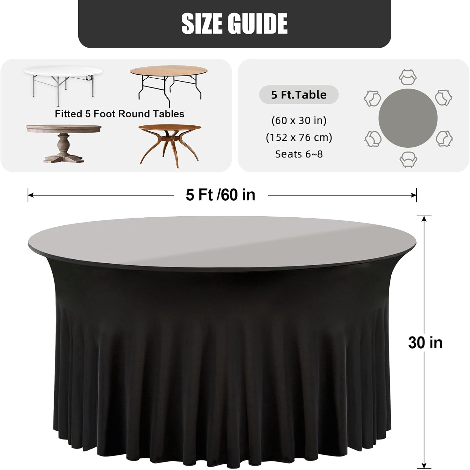 - 【Black Round Spandex Tablecloth 60 Inch】 - Your Package will come with 8 pack black round spandex tablecloths 120 inch,the diameter of each tablecloth is 60 inches and 30inch in height, to the floor and tighy fitted 5ft round party tables.Manteles de mesa de tela para fiestas.