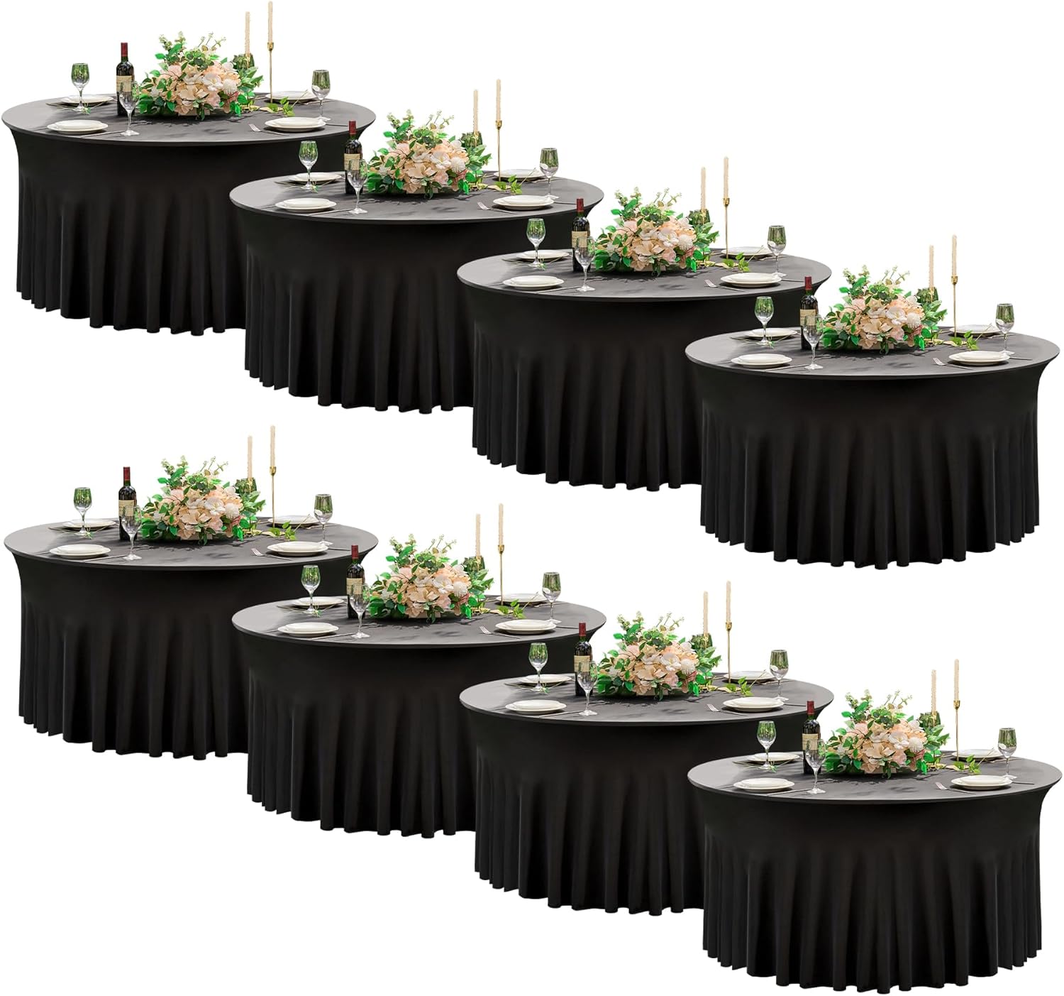 8 Pack Black Round Spandex Tablecloth 60 Inch, Wrinkle Free Stretch 120 Inch Fitted 5ft Black Table Cloths Round Table Covers with Ruffle Skirt for Graduation Wedding Party Banquet