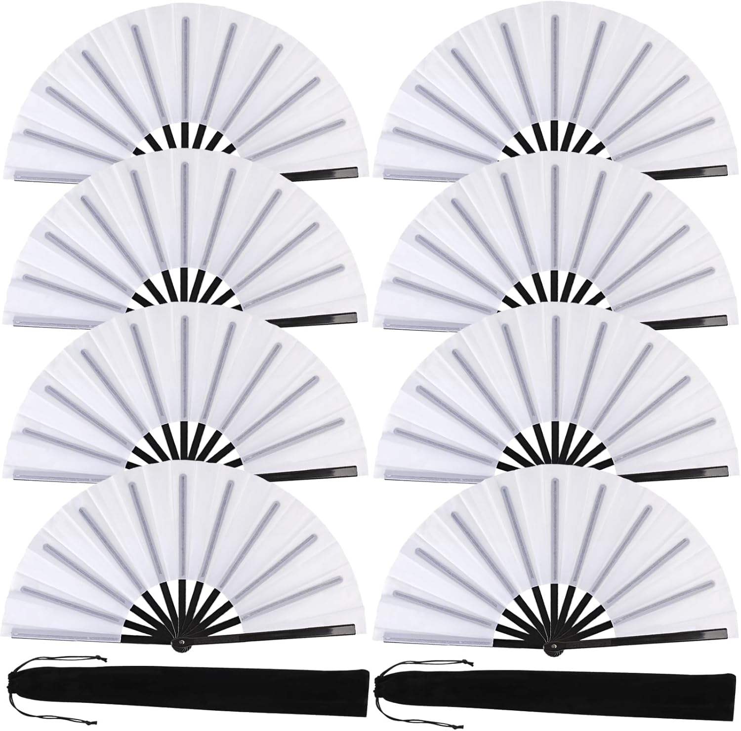 8 Pack Large Folding Hand Fans for Women/Men, Kungfu Taichi Rave Folding Fan with Bag, Large Popping Clacking Fans for Line Dancing, Concert, Party, Festival, Home Decorations(White)