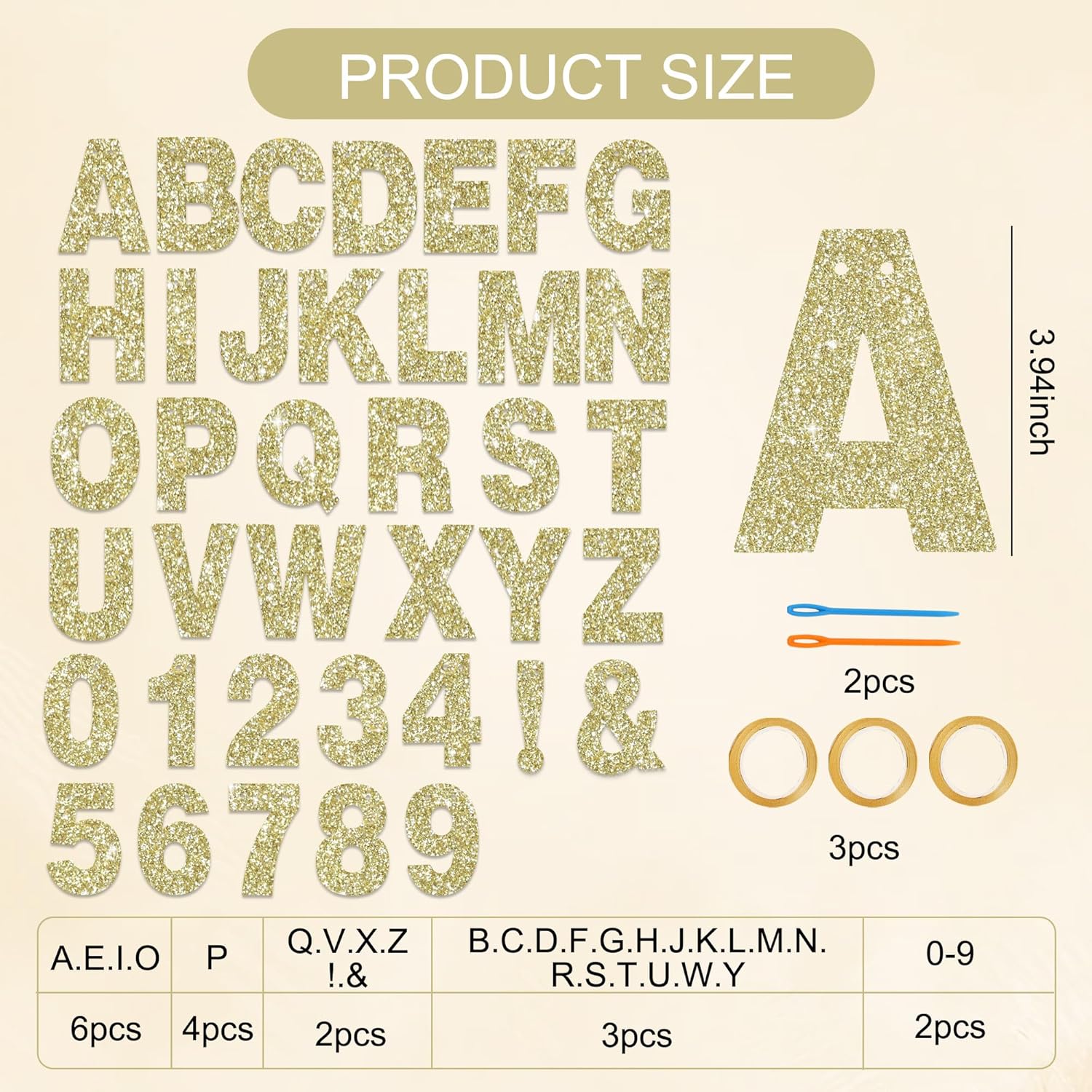 - PACKAGE INCLUDES:There are a total of 111 letters and numbers, 3 ropes, and 2 threading devices.Detailed number of letters and numbers: 6pcs of the letters 'A,E,I,O', 4pcs of the letters 'P', 2pcs of the letters 'Q,V,X,Z,! &',3pcs of the letters 'B,C,D,F,G,H,J,K,L,M,N,R,S,T,U,W,Y', and the numbers 0-9 are 2pcs each. Each letter is 3.94 inch